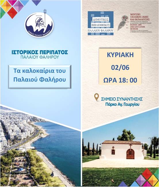Ο Δήμαρχος Παλαιού Φαλήρου Γιάννης Φωστηρόπουλος και η Αντιδήμαρχος Δημοτικών Παιδικών Σταθμών Π. Φαλήρου & Δημοτικών Βιβλιοθηκών Μαίρη Τρύφων, σε συνεργασία με το Μουσείο Σχολικής Ζωής και Εκπαίδευσης, μας προσκαλούν την Κυριακή 2 Ιουνίου στις 18.00 στον ιστορικό περίπατο «Τα καλοκαίρια του Παλαιού Φαλήρου». Συνοδοιπόρος θα είναι ο συγγραφέας και δημοσιογράφος Κώστας Στοφόρος.