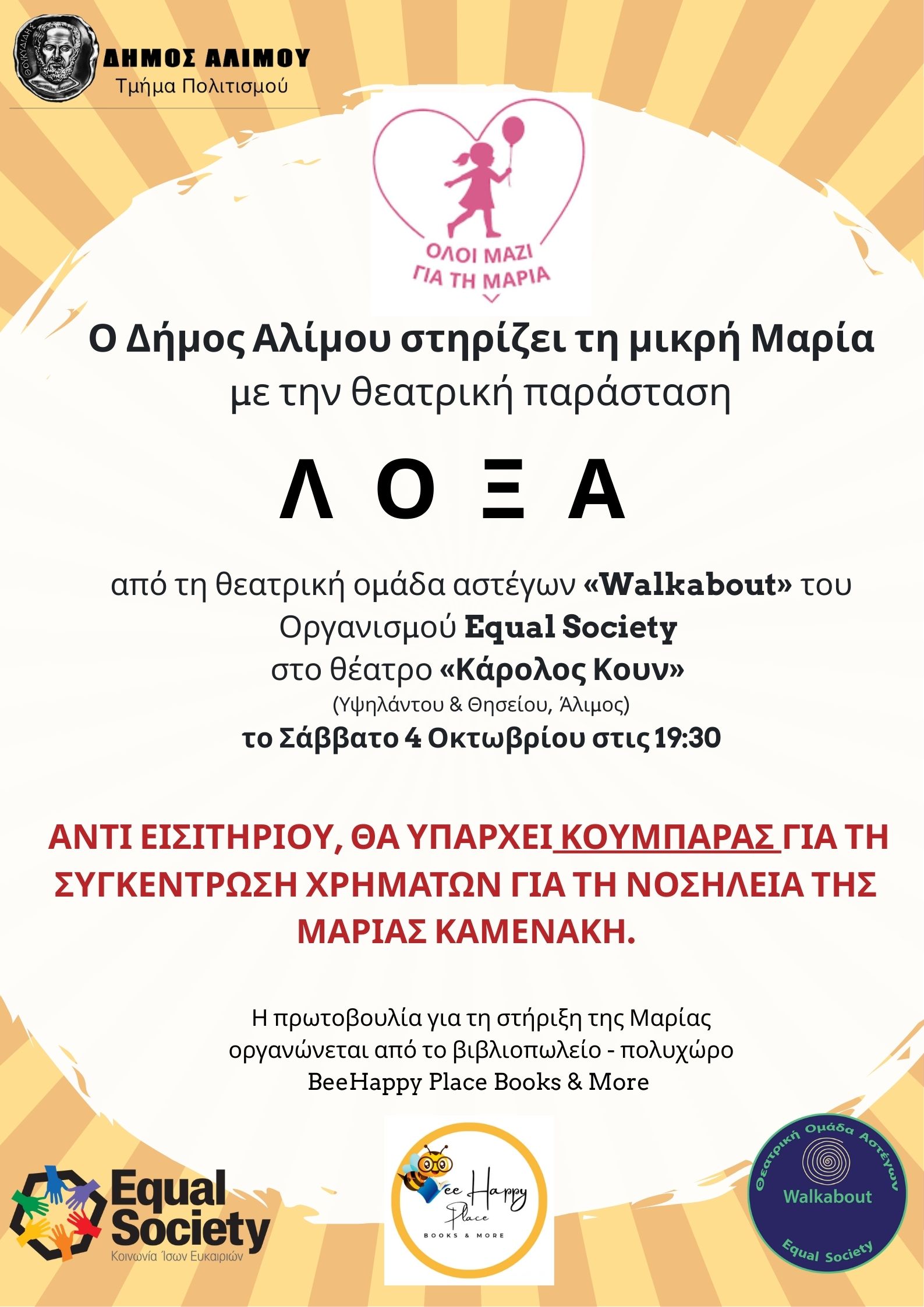 Το Σάββατο 4 Οκτωβρίου, στις 19:30, το Θέατρο «Κάρολος Κουν» στον Άλιμο φιλοξενεί τη θεατρική παράσταση «ΛΟΞΑ» από την ομάδα αστέγων «Walkabout» της Equal Society. Η είσοδος είναι ελεύθερη, ενώ αντί εισιτηρίου θα υπάρχει κουμπαράς για την οικονομική ενίσχυση της νοσηλείας της 13χρονης Μαρίας Καμενάκη.