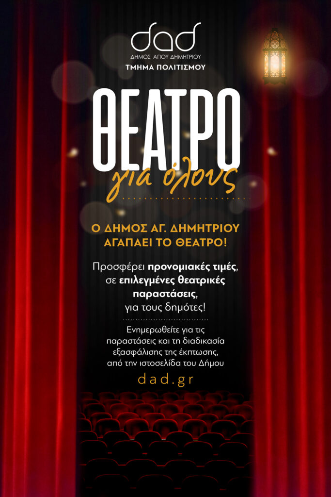 Με περισσότερες θεατρικές επιλογές και τη φετινή χρονιά, η δράση «Θέατρο για Όλους» του Δήμου Αγίου Δημητρίου ξεκινά για να προσφέρει ευκαιρίες ψυχαγωγίας για μικρούς και μεγάλους με προσιτές τιμές.