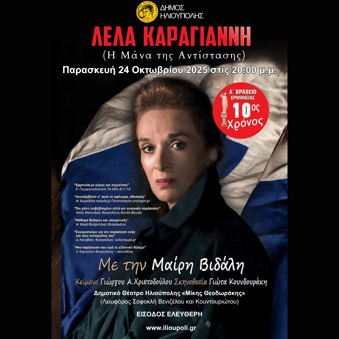 Ο Δήμος Ηλιούπολης μας προσκαλεί στη θεατρική παράσταση «Λέλα Καραγιάννη: Η Μάνα της Αντίστασης», που θα παρουσιαστεί την Παρασκευή 24 Οκτωβρίου 2025, στις 20:00, στο Δημοτικό Θέατρο Ηλιούπολης “Μίκης Θεοδωράκης” (Λεωφόρος Σοφοκλή Βενιζέλου & Κουντουριώτου, Δημαρχείο Ηλιούπολης).