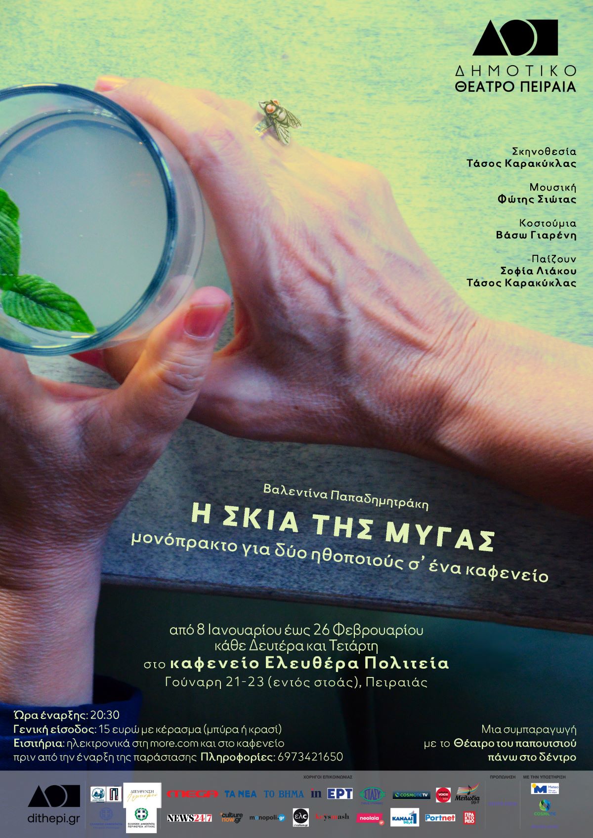 Το Δημοτικό Θέατρο Πειραιά, σε συνεργασία με το «Θέατρο του παπουτσιού πάνω στο δέντρο», προσφέρει μια μοναδική θεατρική εμπειρία με το μονόπρακτο της Βαλεντίνας Παπαδημητράκη, «Η σκιά της μύγας». Μετά την επιτυχημένη παρουσία του σε καφενεία της Δραπετσώνας, του Κορυδαλλού και του Πειραιά, το έργο φιλοξενείται στον ιδιαίτερο χώρο του καφενείου «Ελευθέρα Πολιτεία».