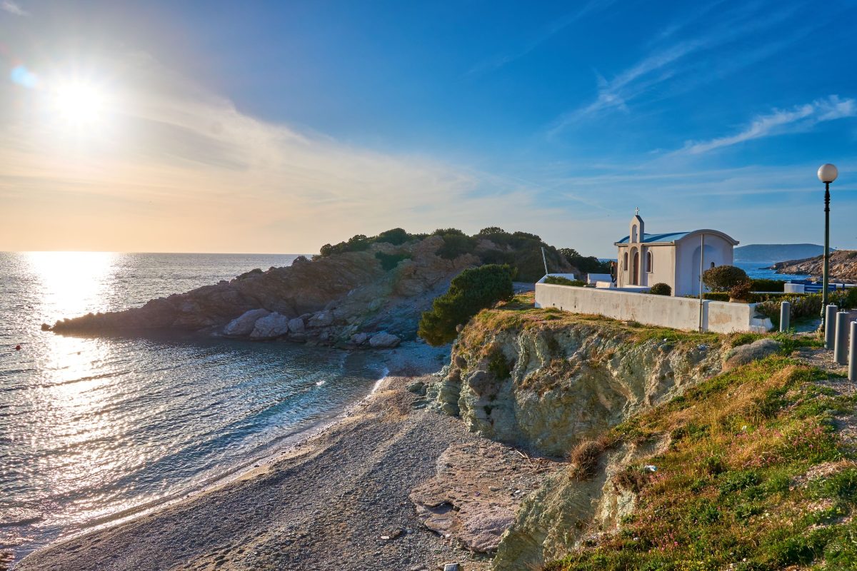 On one side, the Temple of Poseidon, and on the other, the emerald waters of Sounio. Wherever you look, when you find yourself on the rock on which the chapel of Agios Petros in Sounio is built, you will see something that will impress you and make you not know where to turn your gaze first. Below the chapel, there is also the homonymous beach where it is worth taking a dip in the calm and crystal clear waters, either before or after your visit to the chapel. In its exterior, it has a small colorful garden, which is another reason why many choose it for weddings or baptisms.