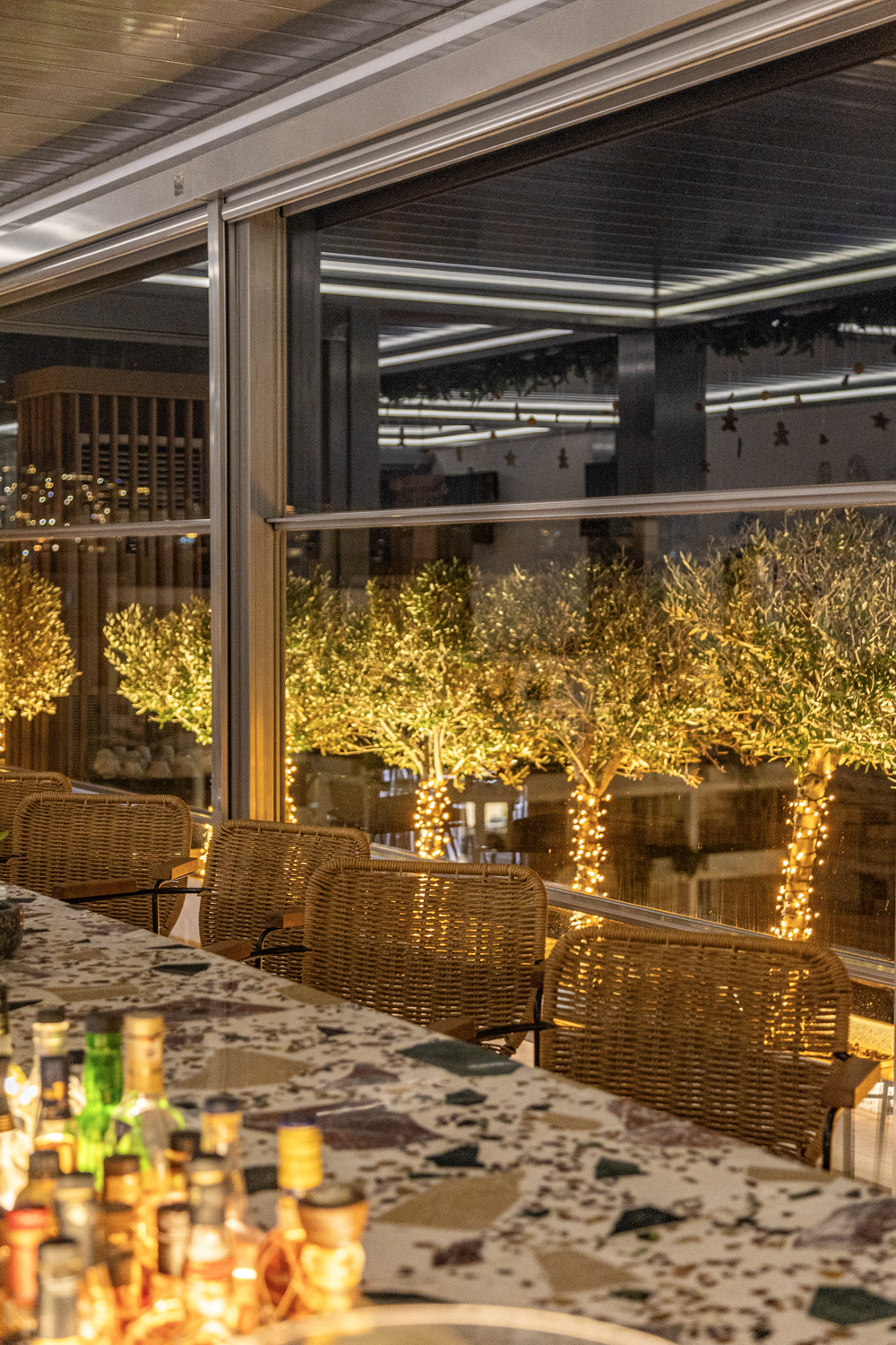 From the moment the elevator lifts you to the seventh heaven of O’live, the restaurant manager, Mr Panagiotis Porichis, takes you in hand to guide you through a view that quite literally takes your breath away, with the Saronic Gulf and the entire Riviera unfolding before you—a view that alone is worth the visit to O’live. The fairytale sunset unravels in deep red, like a stage set in front of you, beyond the blue of the pool. In our case, we were illuminated from above by a full moon, a rare experience for the Southern Suburbs of Athens, which may have many hotels, but very few roof gardens.