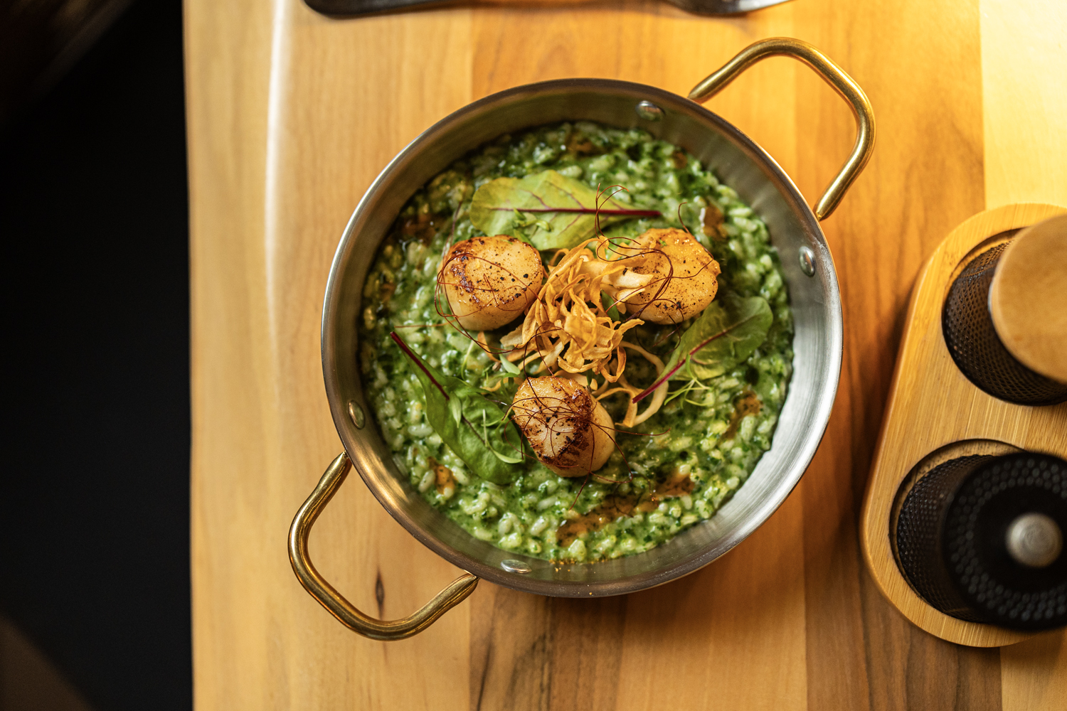 The green salad with poached pear, lightly grilled orange fillets and caramelized pecan crumble features the impeccable poaching of the most fragrant and juicy pear—a salad with French finesse that carries you, all on its own, into the most festive mood. The green risotto with grilled scallops and avruga caviar is comfort in flavor, the green freshness of herbs masterfully binding the risotto, without unnecessary fats or butter. The fillet with mushroom sauce is the epitome of what you dream of in a fillet: quality and depth of flavor in the meat, perfectly judged cooking, just enough sauce to complement rather than overwhelm, accompanied flawlessly by a buttery, refined and crisp gratin dauphinois.