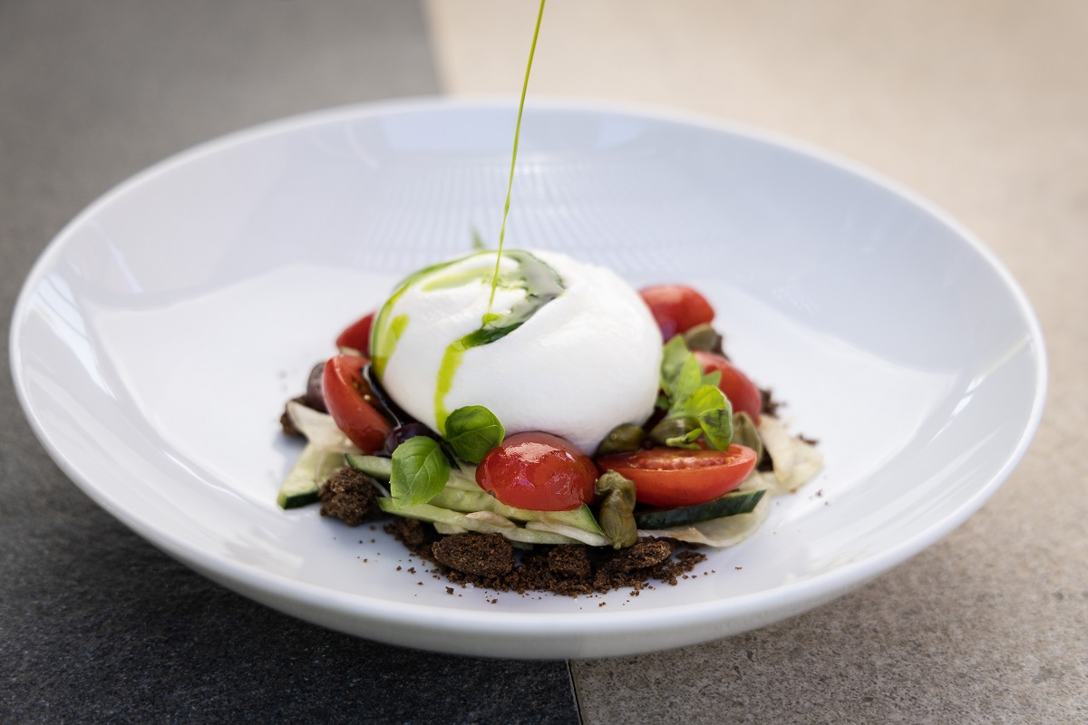 We suggest you start your meal with a velvety taramosalata with bottarga and basil oil, accompanied by crispy rosemary olive pies and a Mediterranean Burrata salad with cherry tomatoes, basil pesto, and carob rusks.