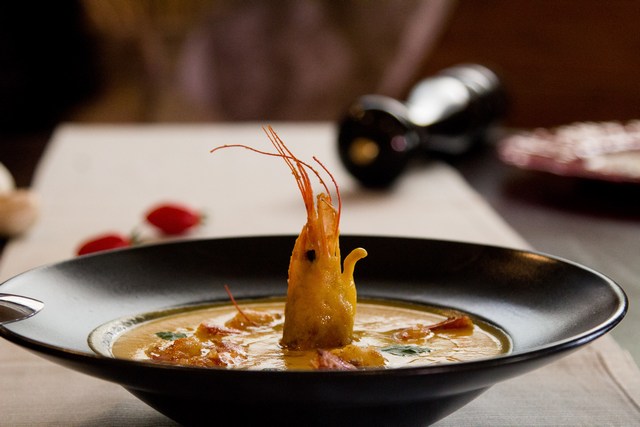 Bελούδινη κρέμα κολοκύθας με μεσογειακές γαρίδες και λάδι τρούφας
