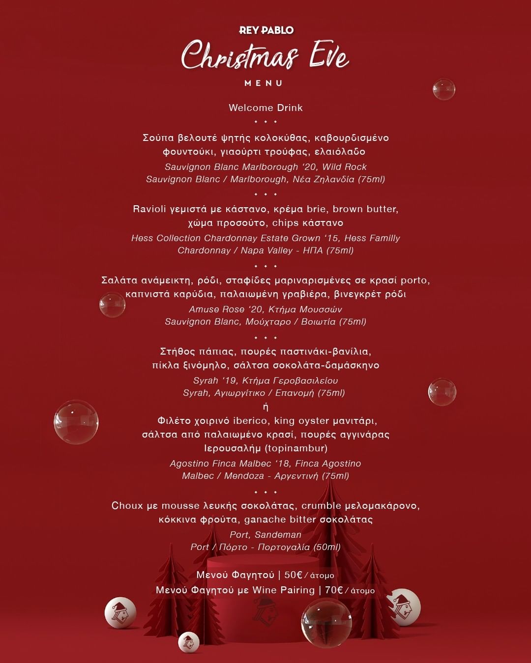Το Rey Pablo μας προσκαλεί να απολαύσουμε ένα ιδιαίτερο μενού το ρεβεγιόν των Χριστουγέννων. Η βραδιά θα ξεκινήσει με welcome drink και θα συνεχιστεί με σούπα βελουτέ ψητής κολοκύθας, καβουρδισμένο φουντούκι, γιαούρτι τρούφας και ελαιόλαδο, ενώ στη συνέχεια θα σερβιριστεί ένα ιδιαίτερο πιάτο με ravioli γεμιστά με κάστανο, κρέμα brie, brown butter, προσούτο και chips κάστανο. Για τη συνέχεια έρχεται μια δροσερή ανάμεικτη σαλάτα με ρόδι, σταφίδες, μαριναρισμένες σε κρασί porto, καπνιστά καρύδια, παλαιωμένη γραβιέρα και βινεγκρέτ ρόδι.