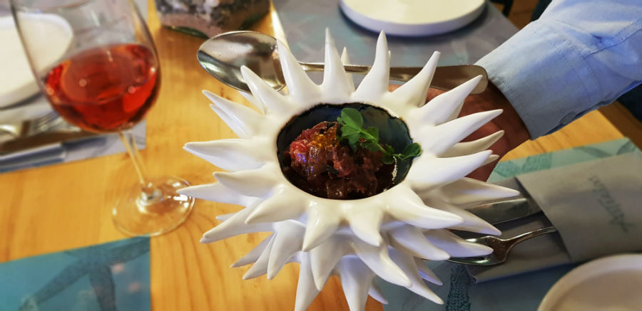 Στο μενού θα βρείτε δημιουργικά πιάτα με θαλασσινά και ψάρι μεταξύ άλλων τα γιουβαρλάκια γαρίδας με μολόχα, καυκαλίθρες και σάλτσα μοσχολέμονου, ροφό με παραδοσιακό ξινό τραχανά και πεσκανδρίτσα ποσέ με πουρέ παστινάκι/ρίζας μαϊντανού και σάλτσα αμπελόφυλλο.