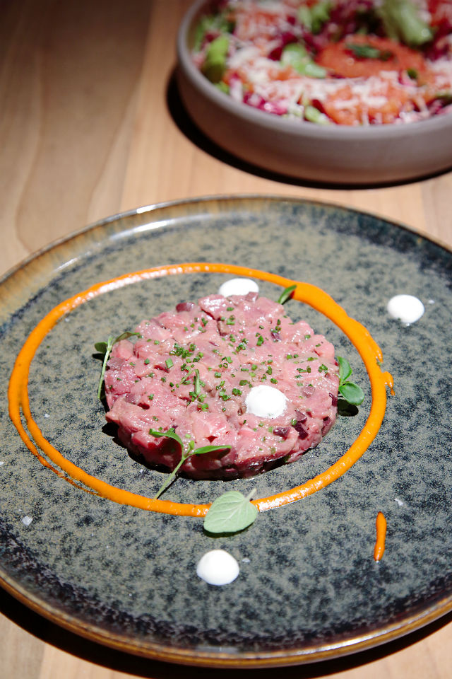 Tα κυρίως πιάτα πλαισιώνονται σοφά από ορεκτικά που μιλούν στο συλλογικό θυμικό, διότι πρόκειται για αρωματικούς κολοκυθοκεφτέδες, comfort τηγανητές πατάτες με αυγά μάτια, σπιτικούς πατατοκεφτέδες καπνιστή μελιτζανοσαλάτα με μανούρι και πιπεριά, αλλά και τραγανά πιτάκια με φέτα από το Πήλιο και ρίγανη. Φυσικά, δε λείπει το ιδανικά ισορροπημένο ταρτάρ από ελληνικό μοσχάρι, με λεμόνι και ελιές.