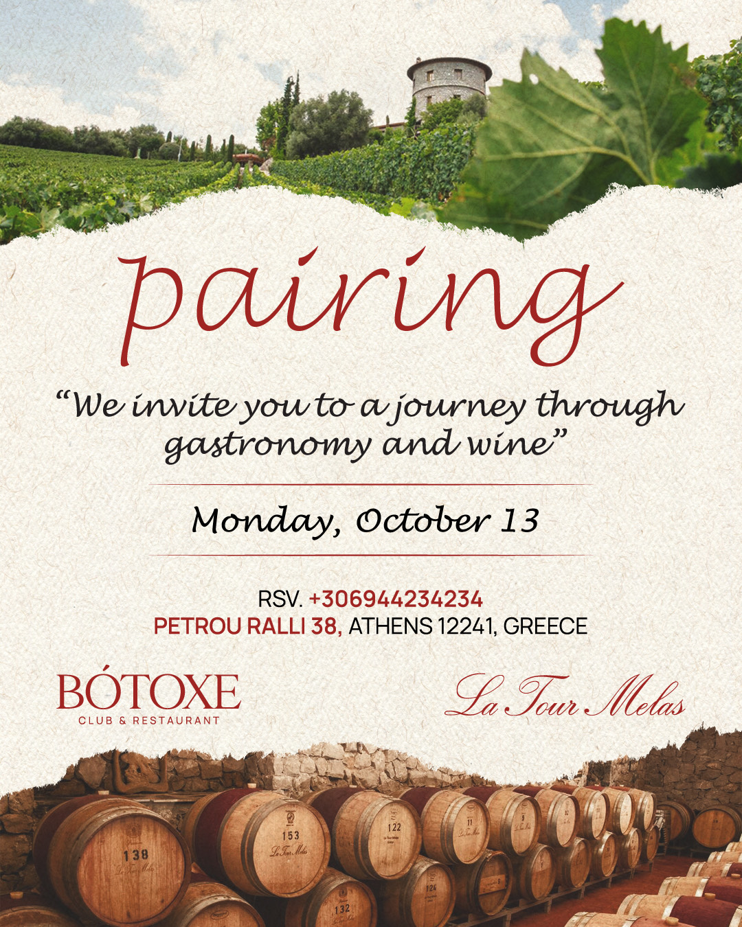 Τη Δευτέρα 13 Οκτωβρίου, το Botoxe Club & Restaurant υποδέχεται το Κτήμα La Tour Melas για ένα μοναδικό wine pairing dinner, όπου η ελληνική παράδοση συναντά τη σύγχρονη γαστρονομία σε πέντε εκλεπτυσμένα πιάτα και αντίστοιχες οινικές επιλογές.