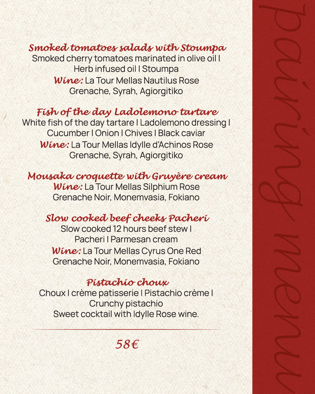 Το ειδικά σχεδιασμένο μενού αντλεί έμπνευση από την ελληνική παραδοσιακή κουζίνα με μοντέρνες, δημιουργικές πινελιές και διεθνείς τεχνικές που αναδεικνύονται μέσα από ένα προσεκτικά επιλεγμένο wine pairing.