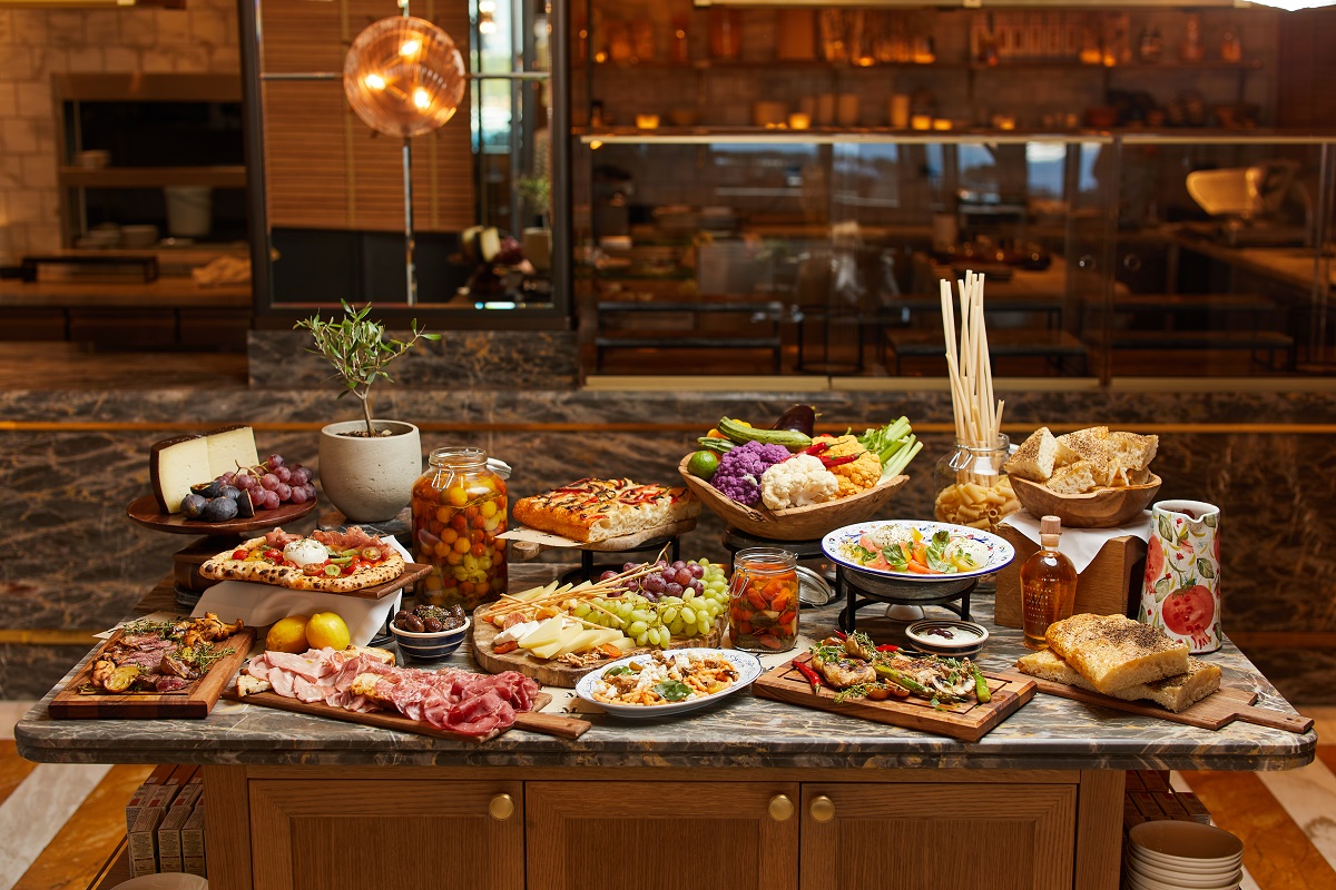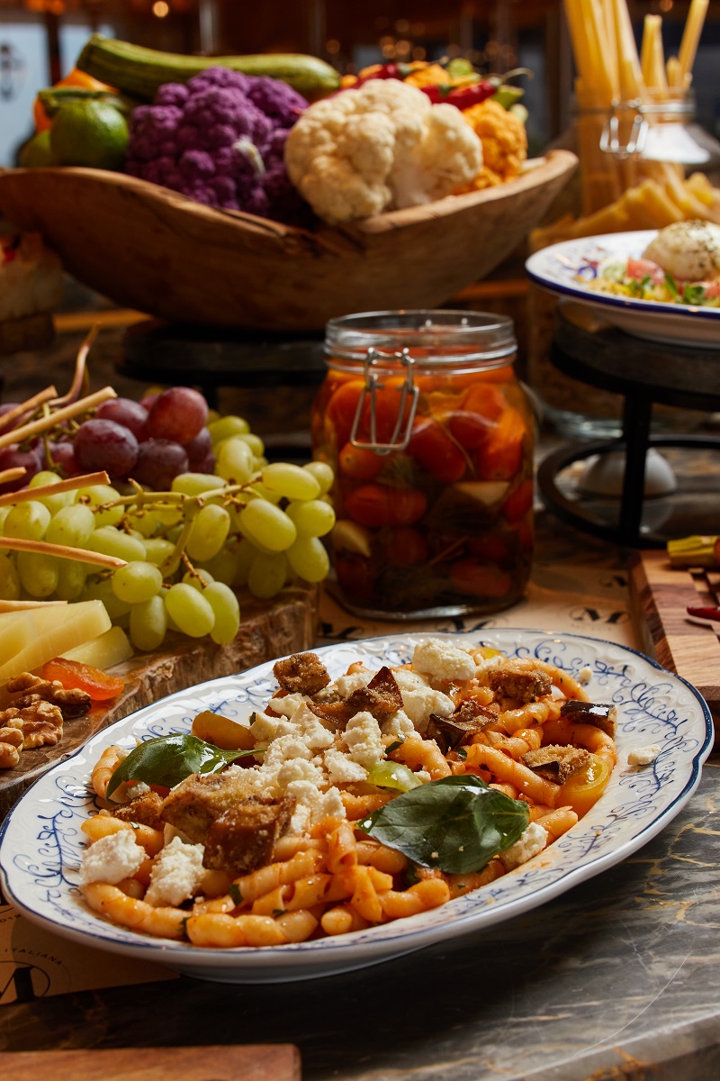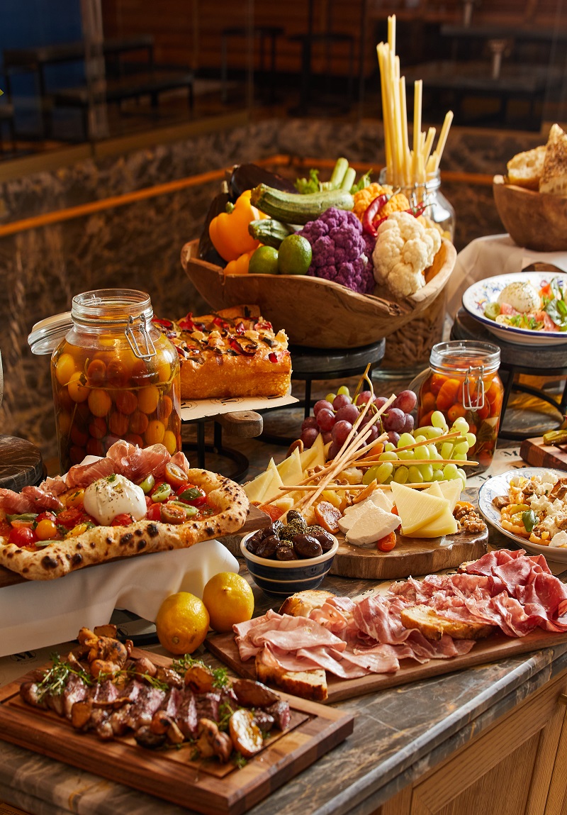 Το brunch συμπληρώνουν ιταλικά τυριά, porchetta από χοιρινό γάλακτος, χειροποίητα ζυμαρικά, καθώς και μεσογειακά πιάτα με κρέας, ψάρι, πουλερικά και άλλα.