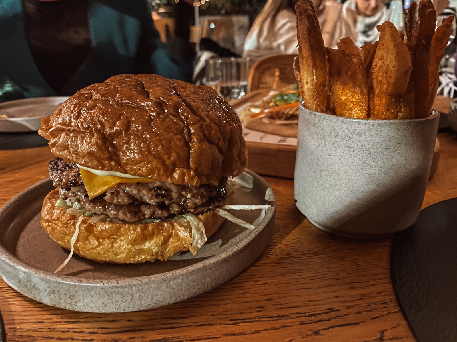 Το μενού, που σερβίρεται μεσημέρι και βράδυ, περιλαμβάνει λίγες και καλές επιλογές, με πιάτα που παρουσιάζουν μια σύγχρονη αλλά ταυτόχρονα οικεία πλευρά. Όσα δοκίμασα τη μέρα που το επισκέφτηκα με άφησαν ικανοποιημένη, αλλά πώς να μην κάνω focus στο burger του; Ένα λαχταριστό smash με διπλό μοσχαρίσιο μπιφτέκι, τσένταρ, κρεμμύδι και iceberg. Και δεν χρειάζεσαι τίποτα περισσότερο.