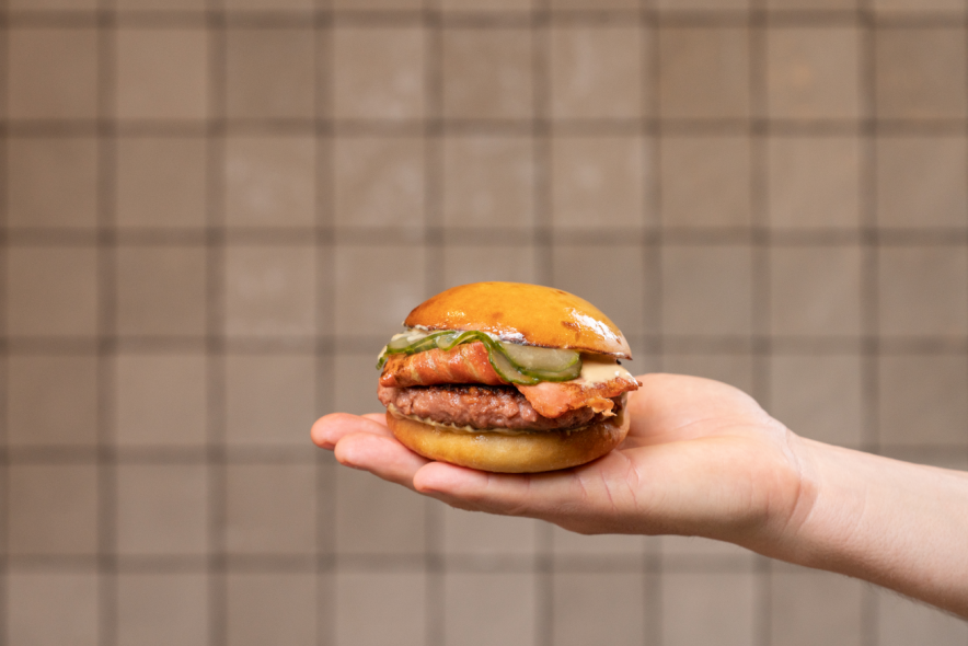 Εκλεκτός, 100% ελληνικός μοσχαρίσιος κιμάς 40 ημερών dry-aged ωρίμασης, ζυμώνεται μόνο με αλάτι σε μπάλα και στη συνέχεια πιέζεται δυνατά με ειδικές πρέσες πάνω στην καυτή επιφάνεια ψησίματος, μέχρι να αποκτήσει πάχος μόλις μισό εκατοστό. Αυτή η διαδικασία μειώνει τον χρόνο μαγειρέματος, ενώ παράλληλα – καθώς οι γωνίες ξεροψήνονται παγιδεύοντας τους ζωμούς και κάθε νόστιμη λιπαρή ουσία του κρέατος στο εσωτερικό – η γεύση εκτοξεύεται σε άλλο επίπεδο.