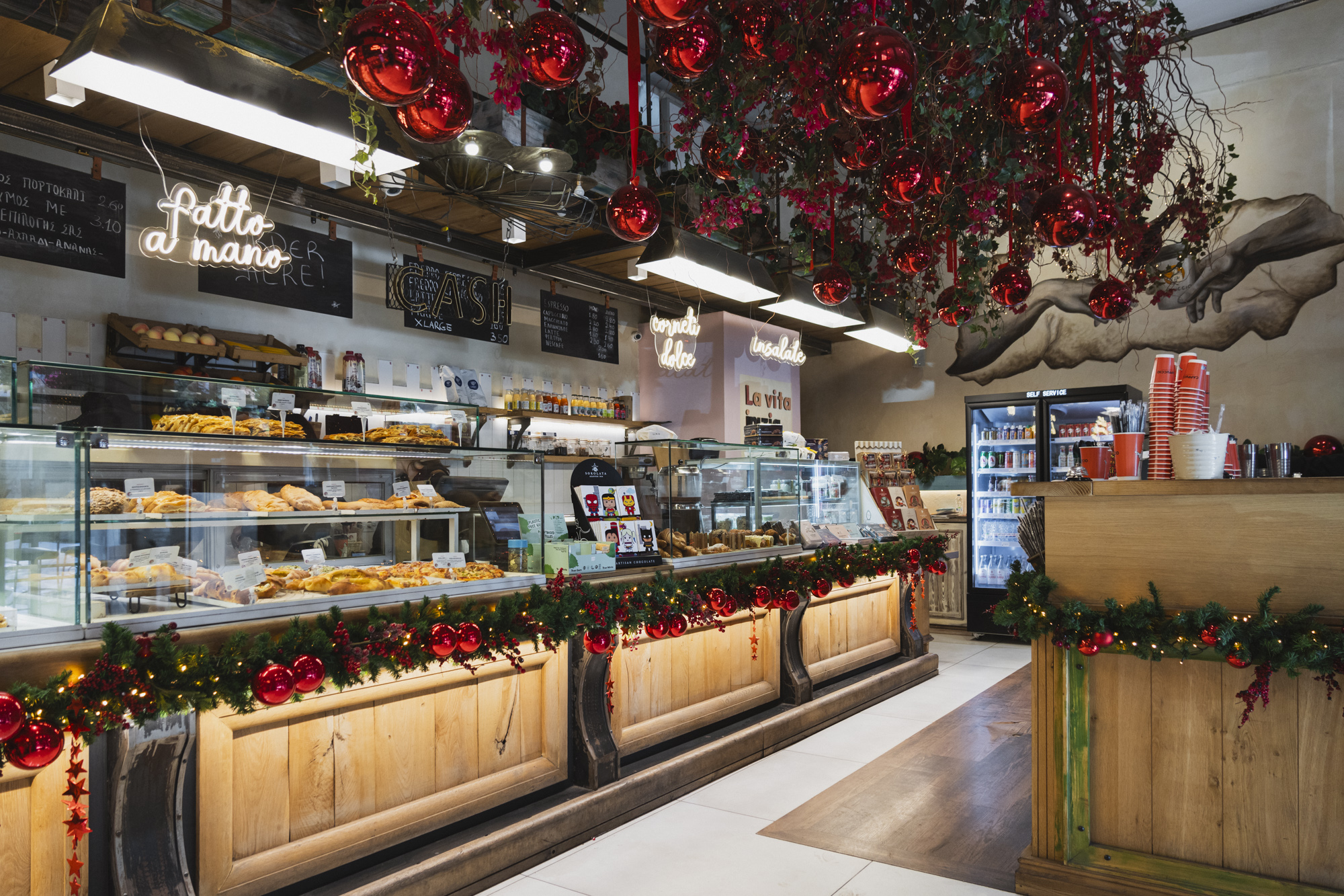 Το μαγαζί λειτουργεί και σαν «delicatessen» και είναι το ιδανικό pit stop για κάθετι ιταλικό. Με τις γιορτές να πλησιάζουν εκτός από τα μπισκότα, premium chips, λικέρ και κρασιά, τα ράφια έχουν γεμίσει με τα χαρακτηριστικά ιταλικά «panettone» στις χρωματιστές συσκευασίες τους. Σε συνδυασμό με τις τεράστιες κόκκινες μπάλες που κρέμονται από το ταβάνι, το οποίο έχει διαμορφωθεί για να μοιάζει με κλιματαριά, και τα χριστουγεννιάτικα ιταλικά τραγούδια που παίζουν σε χαμηλή ένταση δημιουργούν ένα άκρως εορταστικό σκηνικό.