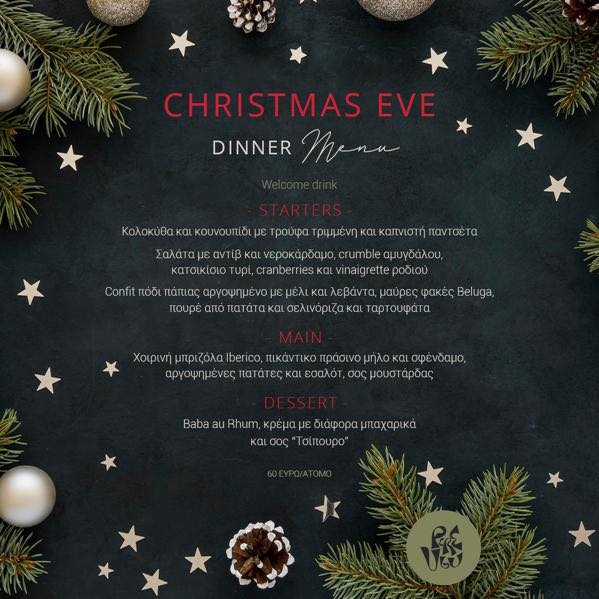 Το Pere Ubu σε προσκαλεί να γιορτάσετε μαζί τις πιο λαμπερές μέρες του χρόνου σε μία μαγική ατμόσφαιρα με ένα ολοκληρωμένο εορταστικό μενού. Για το χριστουγεννιάτικο ρεβεγιόν σε καλωσορίζει με ένα welcome drink. Για ορεκτικό, σερβίρεται κολοκύθα και κουνουπίδι με τρούφα τριμμένη και καπνιστή πανσέτα, σαλάτα με αντίβ και νεροκάρδαμο, crumble αμυγδάλου, κατσικίσιο τυρί, cranberries και vinaigrette ροδιού, καθώς και confit πόδι πάπιας αργοψημένο με μέλι και λεβάντα, μαύρες φακές Beluga, πουρέ από πατάτα και σελινόριζα και ταρτουφάτα. Για το κυρίως πιάτο, ακολουθεί χοιρινή μπριζόλα Iberico, πικάντικο πράσινο μήλο και σφένδαμο, αργοψημένες πατάτες και εσαλότ με σος μουστάρδας. Ο επίλογος γράφεται γλυκά με Baba au Rhum, κρέμα με διάφορα μπαχαρικά και σος “Τσίπουρο”.