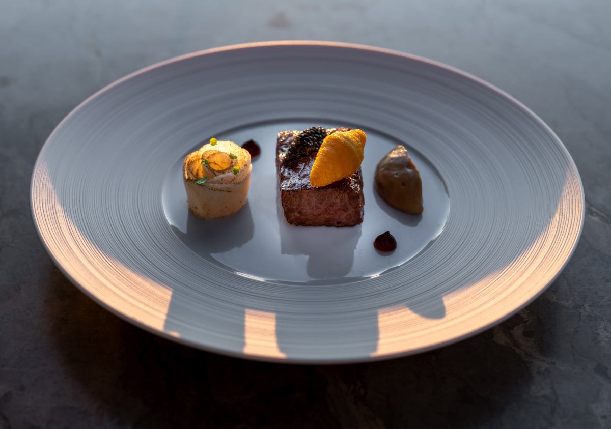 Στη συνέχεια παρουσιάζεται το λαβράκι “Savore” με καραμελωμένο κουνουπίδι, chutney κάπαρης-σταφίδας και μαύρο σκόρδο με μαρμελάδα Ασύρτικο, σε pairing με Karamolegos Santorini Kouloura PDO – Assyrtiko, Athiri, Aidani. Το κυρίως πιάτο είναι μοσχάρι βιολογικής καλλιέργειας με σέσκουλα, Μετσοβόνε, μανιτάρια και jus, σε pairing με Megas Oinos – Agiorgitiko, Skouras Winery.