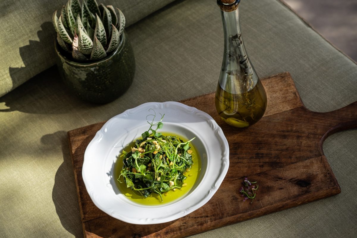 Το γευστικό ταξίδι ξεκινά με προζυμένιο ψωμί, μεταξένιο ταραμά και δροσερή παντζαροσαλάτα. Το χούμους και τα ζουμερά ντολμαδάκια με το αρωματικό αυγολέμονο ξυπνάνε μνήμες, ενώ τα τσιγαριαστά χόρτα και οι τραγανές πατάτες με γραβιέρα και τρούφα δίνουν μια γήινη νότα στο γεύμα μας.