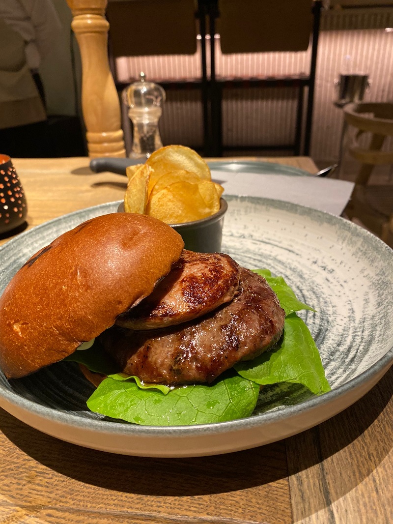 Περνώντας στα κυρίως τώρα, ξεχώρισα το ριζότο με κρέμα κολοκύθας και κατσικίσιο τυρί, γιατί πέρα του ότι μιλάμε για ένα συνδυασμό υλικών που δίνει ένα γευστικό και ιδανικό γι’ αυτή την εποχή πιάτο, είχα μπροστά μου ένα ωραιότατα χυλωμένο ριζότο με το ρύζι να κρατάει ευχάριστα στο δόντι. Βέβαια, δεν μείναμε μόνο εκεί -τα καλά του να βγαίνεις για φαγητό με μεγάλη παρέα-, αλλά δοκιμάσαμε επίσης ψάρι και κρέας, αν και όχι συνδυασμένα μεταξύ τους, παρά τις δελεαστικές Surf ‘n’ Turf προτάσεις του μενού. Ο σολομός φάνηκε ότι τους κέρδισε όλους, χάρη στην χρυσαφένια κρούστα του αλλά και στην σπιρτάδα που του έδινε το τζίντζερ, το οποίο είχαμε στο πιάτο σε τρεις διαφορετικές παρασκευές -στο φρουτένιο pico de gallo όπου η ντομάτα είχε αντικατασταθεί από φράουλα, στη σάλτσα αλλά και στη μαγιονέζα που συνόδευαν τον σολομό. Για το τέλος, αφήσαμε ένα από τα πιο casual πιάτα του μενού, το Black Angus burger, που μας δικαίωσε για την επιλογή μας. Ζουμερό μπιφτέκι Black Angus μπαίνει μέσα σε βουτυράτο brioche και συνδυάζεται με foie gras, μαγιονέζα τρούφας και γαλλική σαλάτα. Τι άλλο να σου πω; Α ναι, ότι έρχεται παρέα με τραγανά, χειροποίητα chips πατάτας που δεν θέλεις να μοιραστείς με κανέναν άλλο δίπλα σου.