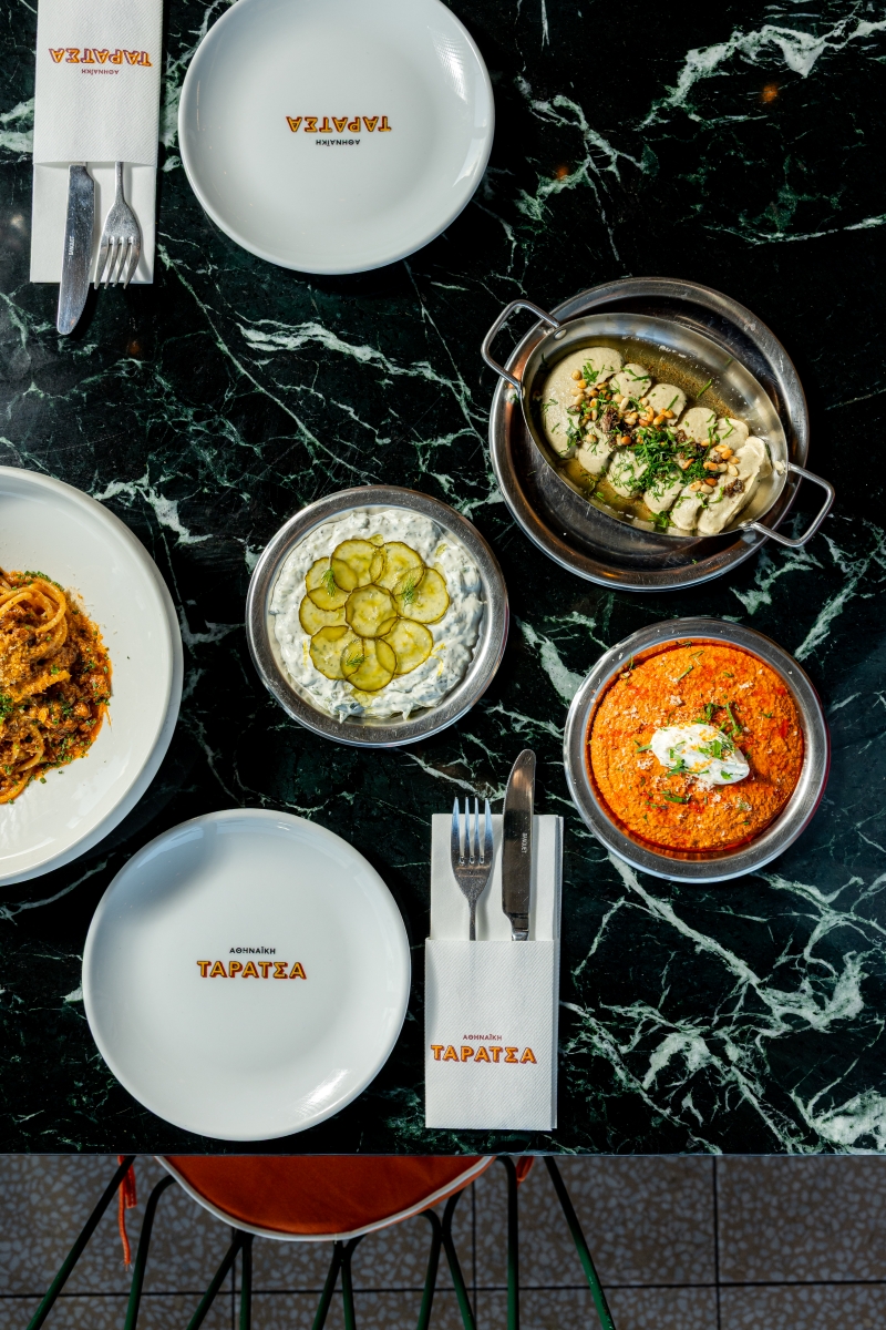 Για περίπου 60 δευτερόλεπτα αγνόησα το ιδιαίτερο design με διακριτική αύρα από ’70s (πράσινα τραπέζια, πορτοκαλί καναπές, μεταλλικές καρέκλες, ανοιχτή κουζίνα και ο καθρέφτης-σήμα κατατεθέν στο bar) και τη βιμπάτη μουσική. Όλα δηλαδή όσα σε κάνουν να νιώθεις ότι σε αυτό το bar restaurant -που φάνηκε από την πρώτη στιγμή που άνοιξε το 2024 ότι είναι «καταδικασμένο» να μακροημερεύσει- όλα είναι comfort και, ταυτόχρονα, τίποτα δεν είναι comme il faut, βαρετό ή προβλέψιμο.