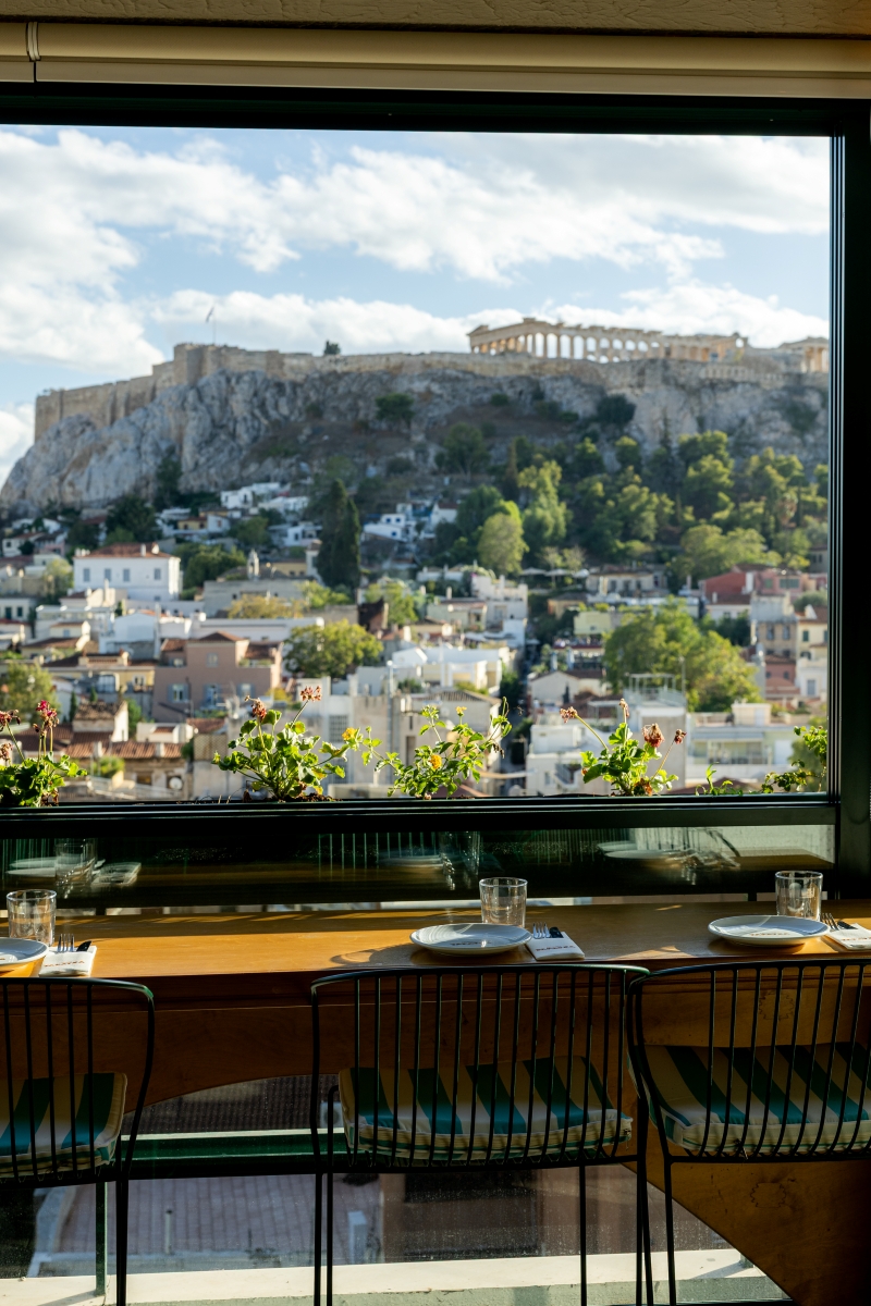 «Χαρά στο κουράγιο όποιου σεφ τολμά να αναμετρηθεί με αυτή τη θέα». Αυτή ήταν η πρώτη σκέψη που πέρασε από το μυαλό μου ανεβαίνοντας τα τελευταία σκαλιά (το ασανσέρ φτάνει μέχρι τον 6ο όροφο) με προορισμό αυτό το «εστιατόριο και μπαρ ανοιχτής θέασης», όπως γράφει κάτω από το όνομα του μαγαζιού. Μπροστά μου η φωτισμένη Ακρόπολη σε όλο της το μεγαλείο, και από κάτω η πλατεία της Μητρόπολης και η Πλάκα.