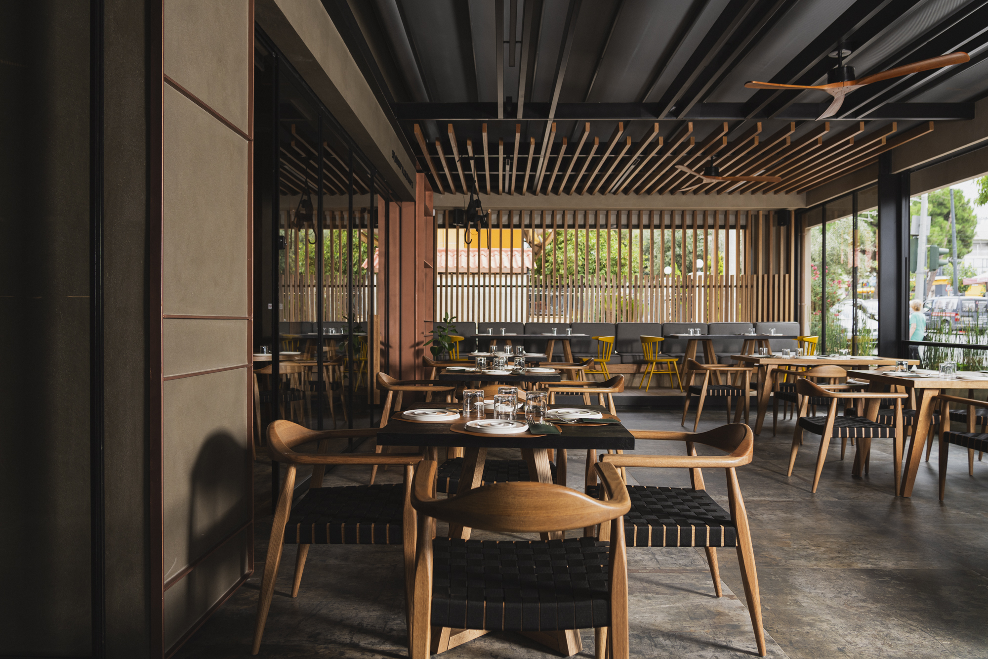 Από εκεί και έπειτα, περνώντας το κατώφλι, μπαίνεις σε ένα εστιατόριο που σου μεταδίδει αμέσως μία ζεστασιά και μία φιλόξενη διάθεση. Το ξύλο κυριαρχεί, όπως και οι γήινες αποχρώσεις γενικώς, σε ένα περιβάλλον που παντρεύει τα cozy με τα πιο industrial στοιχεία και συνθέτει μία σύγχρονη, αλλά παράλληλα οικεία αισθητική που σε προδιαθέτει να περάσεις ώρες εκεί με την παρέα σου, τρώγοντας και πίνοντας. Άλλωστε αυτός ήταν και ένας από τους βασικότερους στόχους του Γιάννη. «Ήθελα να φτιάξω έναν χώρο που θα θυμίζει σπίτι σε όποιον μπαίνει μέσα. Να νιώθει άνετα, να απολαμβάνει πραγματικά την έξοδό του πέρα από το φαγητό, να ξεχνά να φύγει».