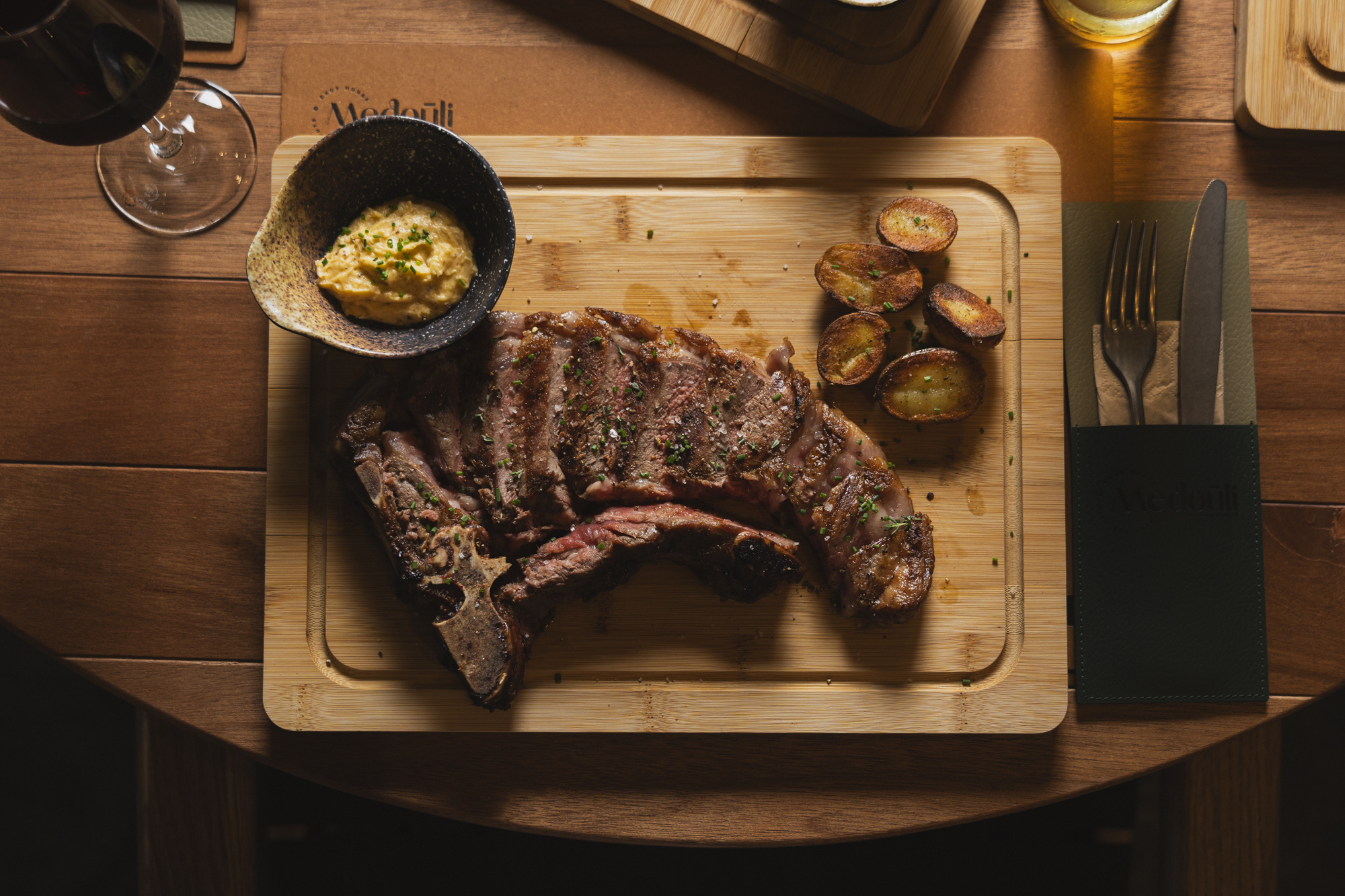 Το μενού πετυχαίνει έναν ιδανικό συνδυασμό. Είναι σφιχτό και στακάτο, χωρίς πολλές φανφάρες, ενώ προσφέρει πολλές διαφορετικές επιλογές. Για τον ορκισμένο κρεατοφάγο, τον ψαγμένο όσον αφορά τις ιδιαίτερες κοπές και τους τρόπους ψησίματος, αλλά και όποιον αγαπά τις γνήσιες ελληνικές γεύσεις. Το ιδανικό βέβαια, είναι ένας συνδυασμός των δύο, με πιάτα στη μέση για όλη την παρέα, ώστε να ζήσεις σωστά όλη την εμπειρία που προσφέρει το Medouli.