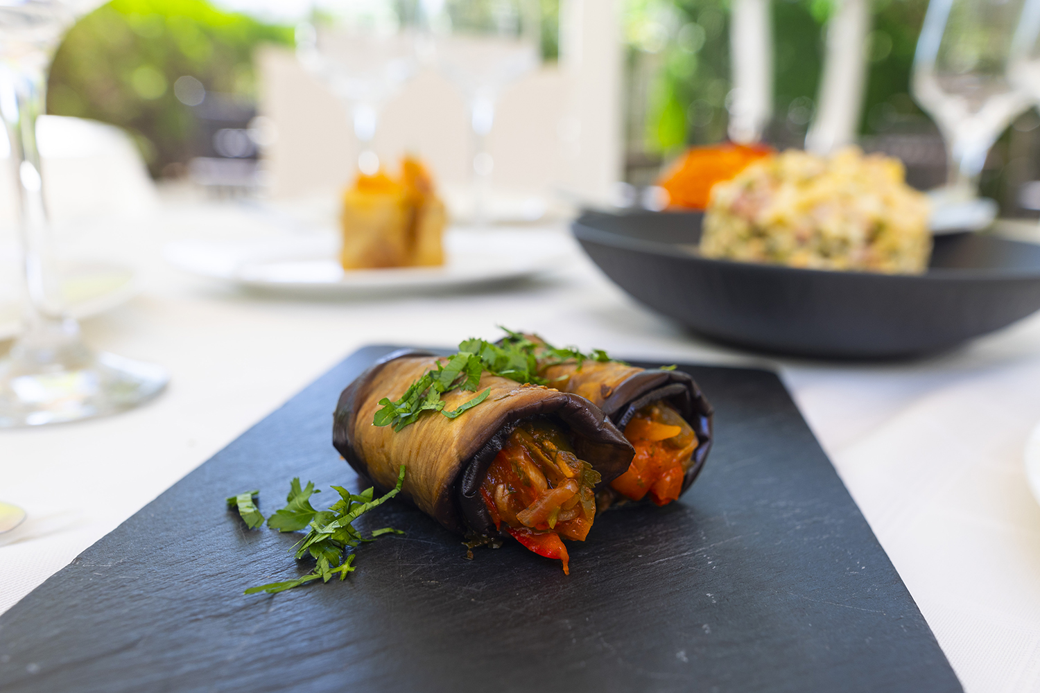 Σειρά είχαν τα ρολάκια μελιτζάνας και πιπεριάς φλωρίνης με πικάντικη πάστα καρυδιού και ρόδι, ένα πιάτο που θα ενθουσιάσει τους λάτρεις της μελιτζάνας καθώς είναι πολύ καθαρή η γεύση της και σε συνδυασμό με την πιπεριά μοιάζουν με δροσερό και ιδιαίτερο μπριάμ.