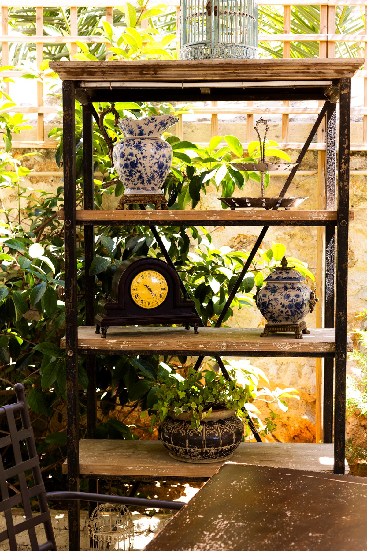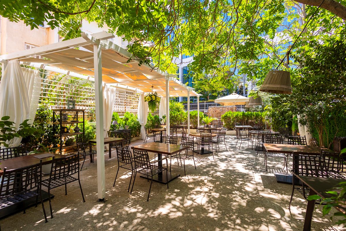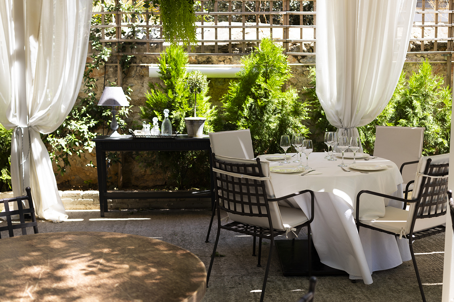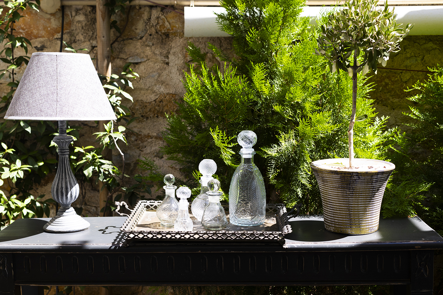 Στολισμένη σε λευκούς τόνους, με κουρτίνες από ταφτά και υπέροχα vintage αντικείμενα όπως προσελάνες και παλιά ρολόγια. Για τη μέρα διαθέτει σκίαστρο αλλά στα περισσότερα σημεία τα φυλλώματα των δέντρων αρκούν για να προσφέρουν σκιά. Το βράδυ ανάβουν τα φαναράκια που δημιουργούν μια ατμόσφαιρα ρομαντική και νοσταλγική. Όσον αφορά την καλοκαιρινή ζέστη, αυτή δεν αγγίζει την αυλή.