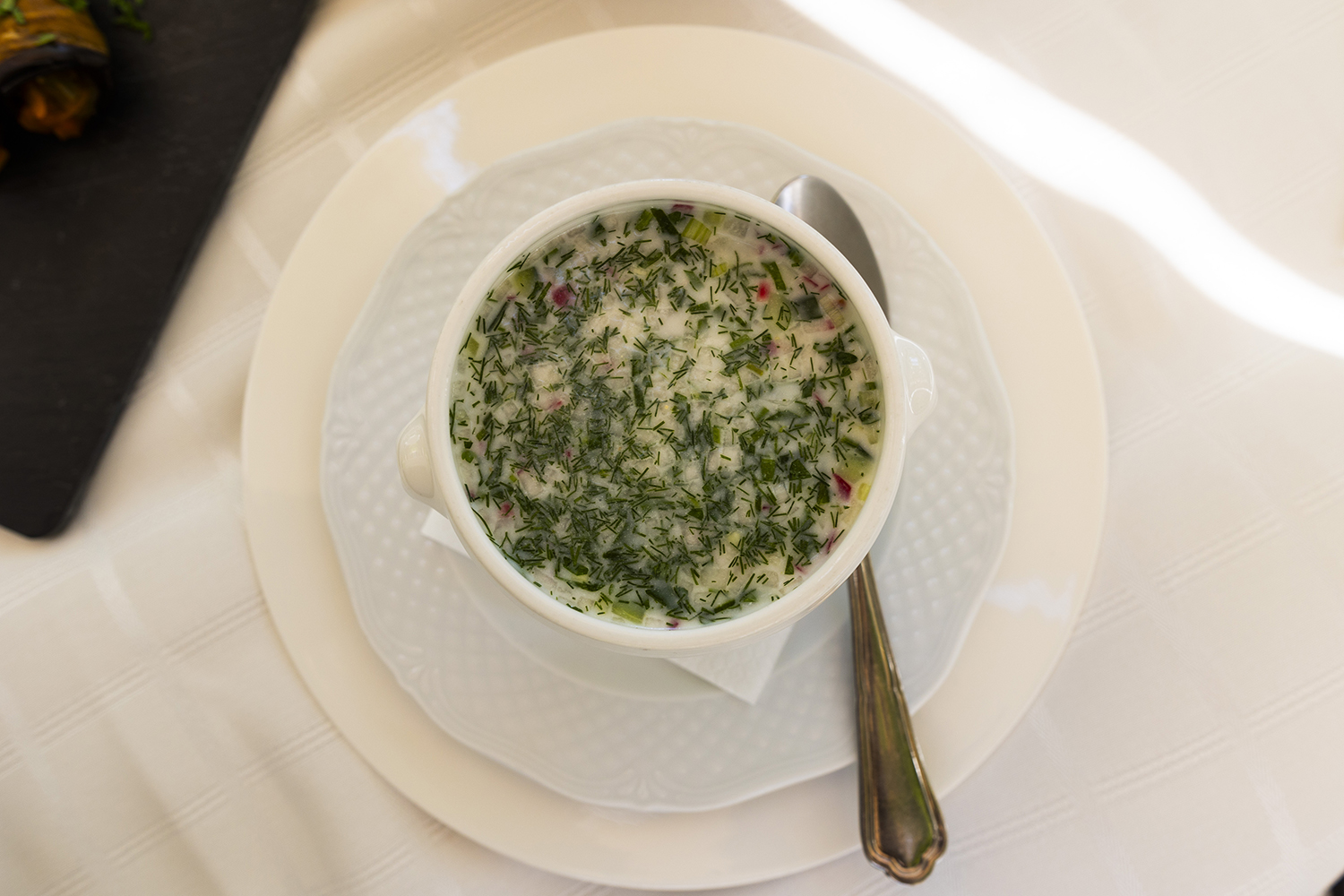 Τελευταίο πιάτο η κρύα σούπα, κάτι που δεν συνηθίζεται στην ελληνική κουζίνα. Η Οκρόσκα είναι σούπα λαχανικών που περιέχει πατάτα, αβγό, ραπανάκι, αγγούρι και καπνιστό σαλάμι, με βάση το γιαούρτι. Ηταν ένα πολύ δροσιστικό πιάτο με αρκετό άνηθο και κρεμμυδάκι, αλλά και πολλά ψιλοκομμένα λαχανικά.