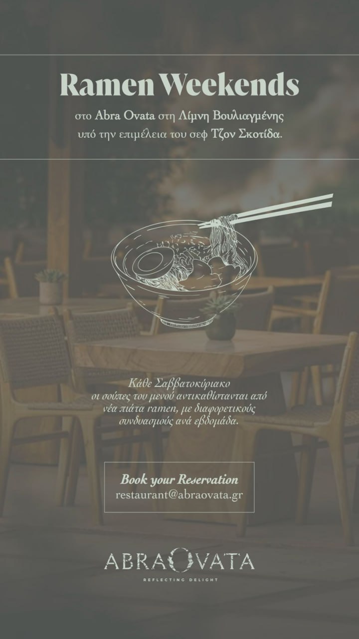 Τα Ramen Weekends στο AbraOvata αποτελούν μια διαφορετική εμπειρία για τους επισκέπτες της Λίμνης Βουλιαγμένης, προσκαλώντας τους να ανακαλύψουν νέες γεύσεις μέσα από πιάτα που αλλάζουν, εξελίσσονται και εκπλήσσουν κάθε Σαββατοκύριακο.