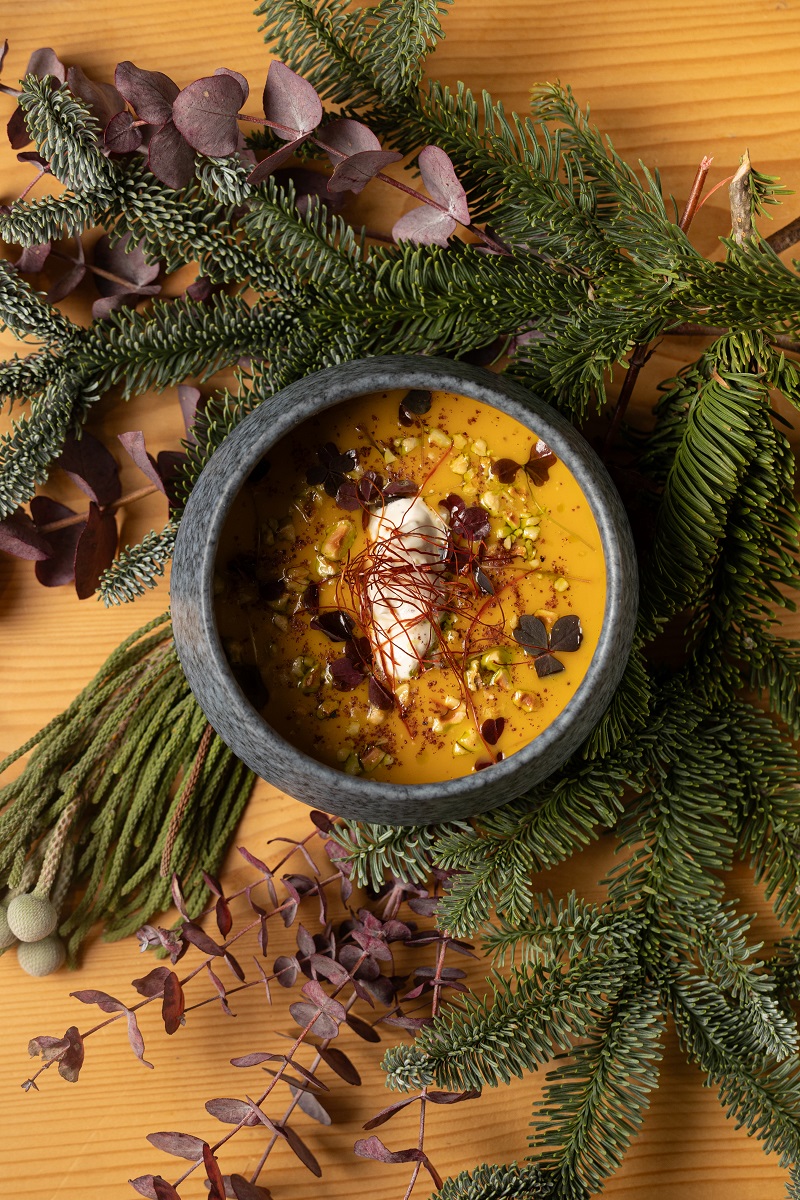 Η αρχή γίνεται με σούπα και συγκεκριμένα βελουτέ κολοκύθας, με πούδρα παντζαριού, γιαούρτι με ξύσμα lime, αρωματισμένα κρουτόν και λάδι βασιλικού. Ακολουθεί η σαλάτα με φύλλα εποχής, αχλάδι ποσέ με αρώματα ιβίσκου, ρόδι, καβουρδισμένο κουκουνάρι, flakes από μετσοβόνε και dressing ξινόμηλο με φραμπουάζ.