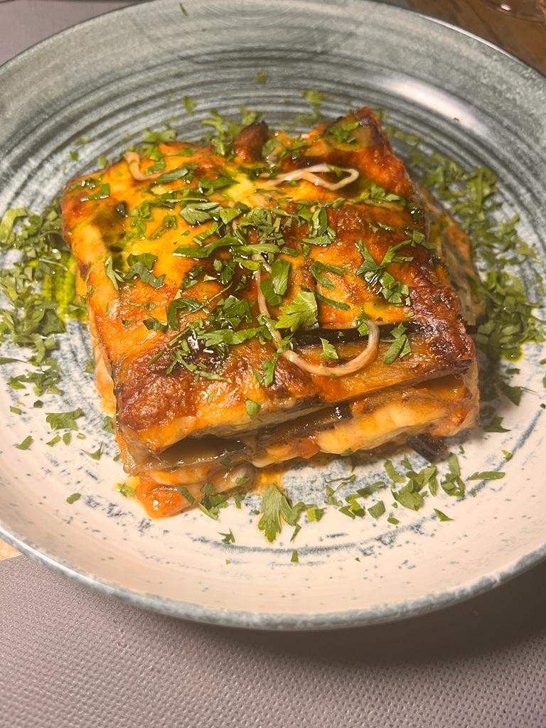 Από την ενότητα των ορεκτικών διαλέξαμε επίσης τη μελιτζάνα, με σάλτσα φρέσκιας ντομάτας, μοτσαρέλα και βασιλικό -το αγαπημένο πιάτο του Κωνσταντίνου- και γοητευτήκαμε από την comfort θέρμη και την απλότητά της: το φετινό καλοκαίρι, άλλωστε, έχει πάρει «παράταση» και οι θερμοκρασίες ευνοούν ακόμη και τώρα το δημοφιλές μωβ λαχανικό με έξτρα γλύκα και νοστιμιά. Ενδιαφέρον από την ίδια ενότητα είχε και το wine friendly μοσχαρίσιο ταρτάρ που συνδύαζε όμορφα τα πικάντικα στοιχεία με την μεστή γεύση του καλοκομμένου κρέατος.