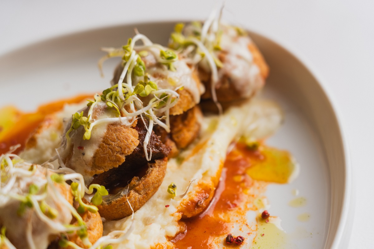 Στα κυρίως βρήκαμε ένα ξεχωριστό αλμυρό προφιτερόλ, το οποίο όμως πήραμε για τη μέση, καθώς είναι ένα κι ένα για μοιρασιά. Πρόκειται για σουδάκια γεμιστά με μοσχαράκι ραγού, που σερβίρονται με πουρέ πατάτας και κρέμα από γραβιέρα Νάξου.