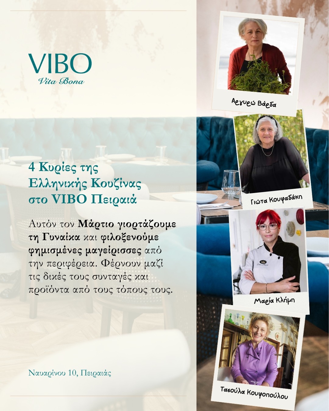 Τέσσερις γυναίκες, τέσσερις διαφορετικές διαδρομές, τέσσερις βραδιές με κοινό παρονομαστή τη σοβαρή, βιωμένη ελληνική κουζίνα. Ο Μάρτιος στο Vibo Πειραιά γίνεται ένας μήνας αφιερωμένος στη γεύση, στη μνήμη και στη δημιουργία.
