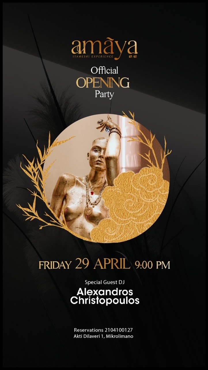 Το Amaya Itameshi Cuisine, το νέο αγαπημένο εστιατόριο του Πειραιά, σηματοδοτεί την έναρξη του φετινού καλοκαιριού την Παρασκευή 29 Απριλίου με ένα upscale opening party στον εξωτερικό του κήπο. Special Guest DJ ο Cosmopolitan Έλληνας παραγωγός Αλέξανδρος Χριστόπουλος, compiler των gold sellers CD ‘Sunset & Sunrise’ & ‘La Suite’, θα συνθέσει το soundtrack του φετινού καλοκαιριού με ξεχωριστές μουσικές επιλογές από balearic, bossa, mellow, spiritual και deep house ήχους.
