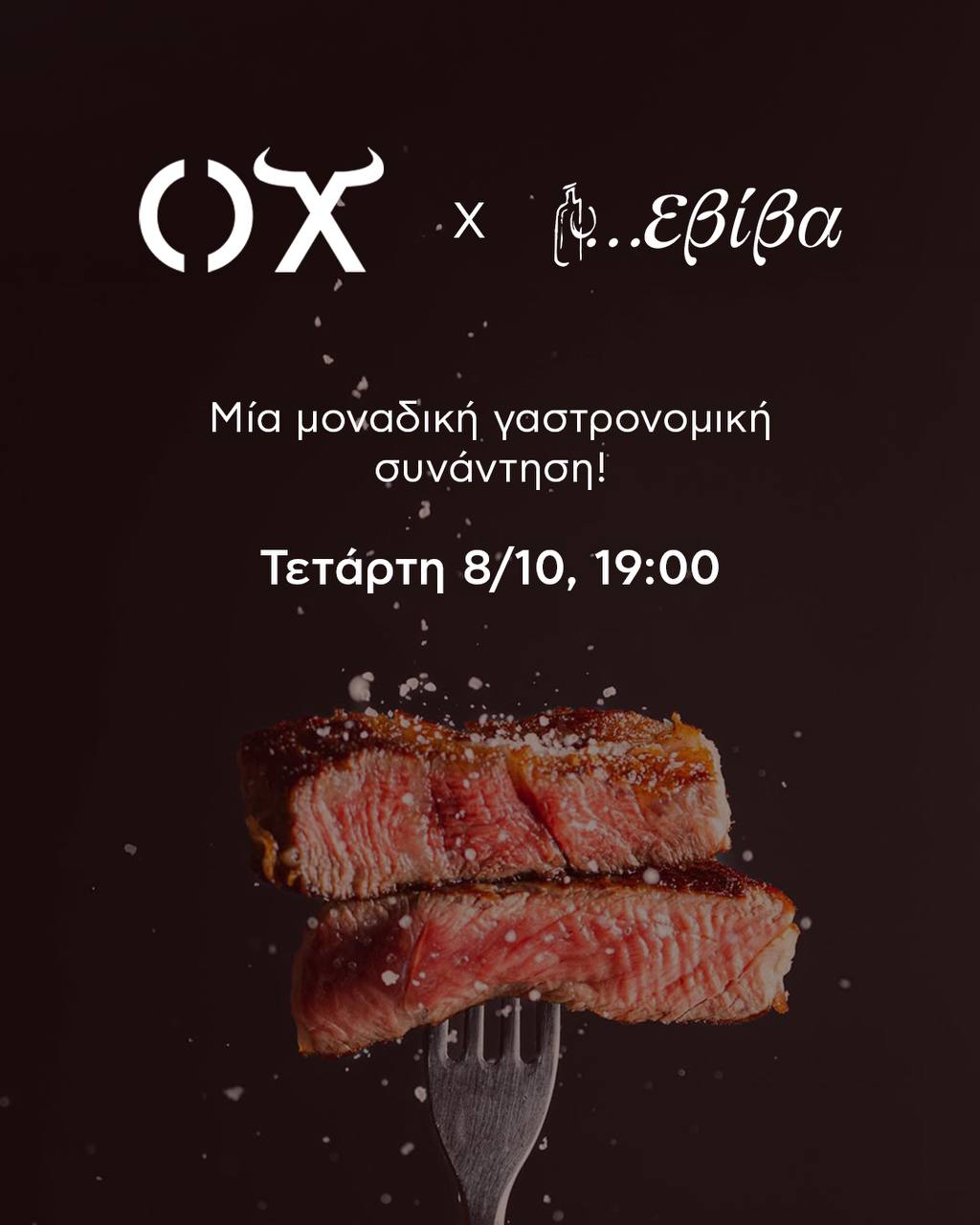 Το εστιατόριο OX Athens στα Ιλίσια, ένας από τους πιο ξεχωριστούς προορισμούς για τους λάτρεις του κρέατος στην Αθήνα, φιλοξενεί το Εβίβα από το Βοχαϊκό Κορινθίας την Τετάρτη 8 Οκτωβρίου 2025, από τις 19:00 και μετά.