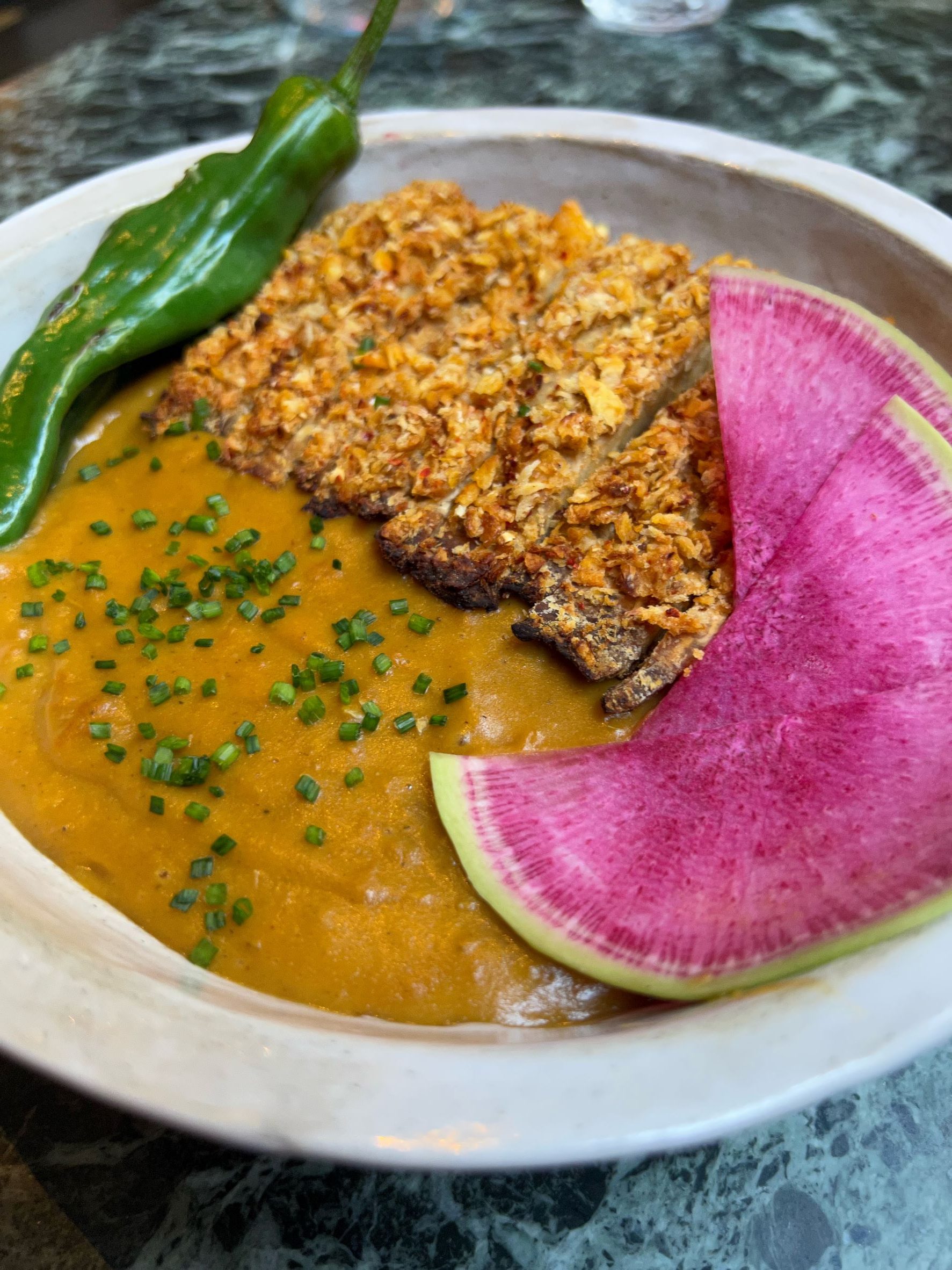 Μια ακόμη must επιλογή είναι το «Dynamite»- σωστός «δυναμίτης», που θυμίζει τηγανητό κοτόπουλο, αλλά φτιάχνεται από αλεύρι ρεβιθιού πλασμένο με έναν ιδιαίτερο ζωμό λαχανικών και μπαχαρικών. Στη συνέχεια αυτό μαρινάρεται σε ασιατική μαρινάδα, πανάρεται με δημητριακά και ψήνεται στον φούρνο. Σερβίρεται με ρύζι για σούσι, ενώ περιχύνεται με «φουρικάκε», το οποίο όπως εξηγεί ο Άλκης είναι γνωστό στην «γλώσσα» της ασιατικής κουζίνας και είναι ένα μείγμα που φτιάχνεται από διαφορετικά φύκια. Ακόμη, το πιάτο περιλαμβάνει σιρόπι από μίσο (ένα είδος πάστας που παρασκευάζεται κυρίως από φασόλια σόγιας, αλάτι και ρύζι ή κριθάρι- αν βλέπεις master chef το έχεις σίγουρα ακούσει) και σιρόπι αγαύης, καθώς και μια κρύα σαλάτα από κοφτό μακαρόνι και χειροποίητη, spicy μαγιονέζα.