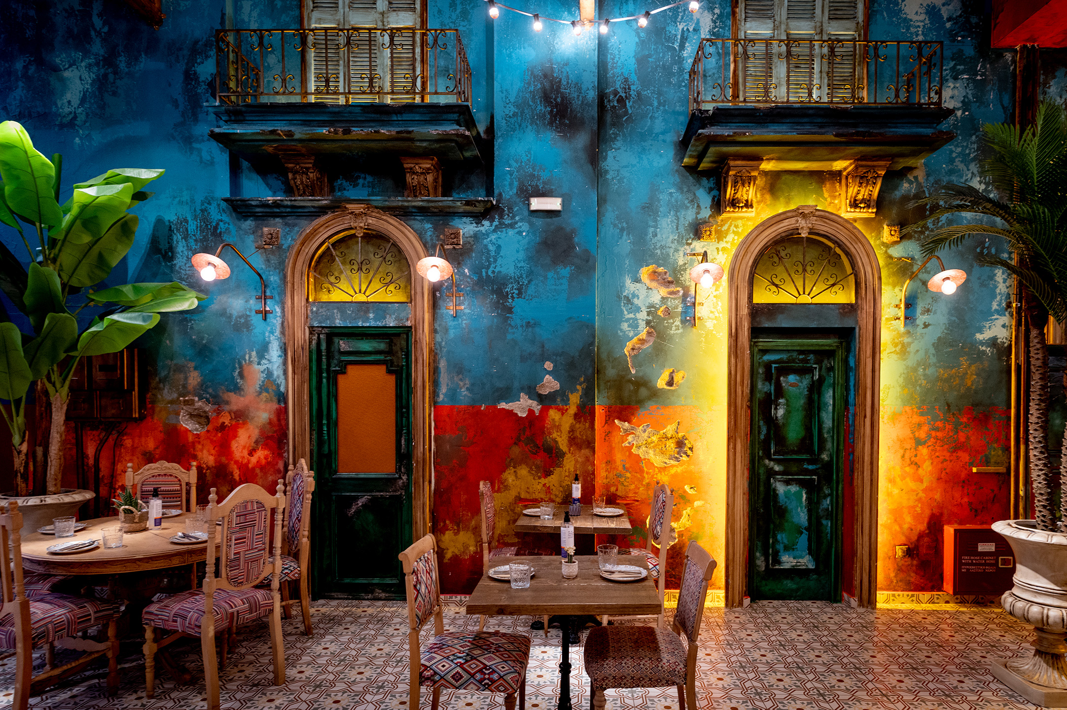 Τα απίθανα κόκκινα, σμαραγδί και μπλε χρώματα, η ψηλοτάβανη αίθουσα, οι καλαίσθητοι πολυέλαιοι εποχής, οι old style ανεμιστήρες οροφής και το μαρμάρινο μπαρ σε μεταφέρουν με το πρώτο κιόλας βήμα σου στην αίθουσα στη Λατινική Αμερική της ισπανικής αποικιοκρατίας. Η αριστερή πλευρά είναι αφιερωμένη στις ταπεινές φτωχογειτονιές, χρώματα ελαφρώς ξεθωριασμένα, μπαλκόνια λιτά και τοίχοι με έντονα τα σημάδια της φθοράς ενώ η δεξιά πλευρά είναι μια αναφορά στα αρχοντόσπιτα της εποχής. Και εάν αναρωτιέσαι πως μπορεί να συνυπάρχουν δυο τόσο διαφορετικοί κόσμοι σε μια αίθουσα, θα σου πω πολύ απλά, μοναδικά.