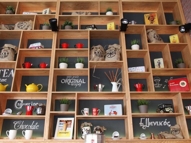 Μια ματιά στα ράφια του Bruno είναι αρκετή, αφού εκεί μπορείς να δεις σε μια μικρή έκθεση τα υλικά που χρησιμοποιούν για να φτιάξουν τον καφέ σου. Kι αν σου κάνει εντύπωση ότι σου σερβίρουν το freddo espresso σε χάρτινο ποτηράκι, η εξήγηση είναι απλή ‘Όλα μας τα ποτήρια είναι χάρτινα με διπλή επένδυση και όχι πλαστικά, για να μην παγώνει ή αντίστοιχα ζεσταίνεται ο καφές και να διατηρείται η ποιότητά του’.