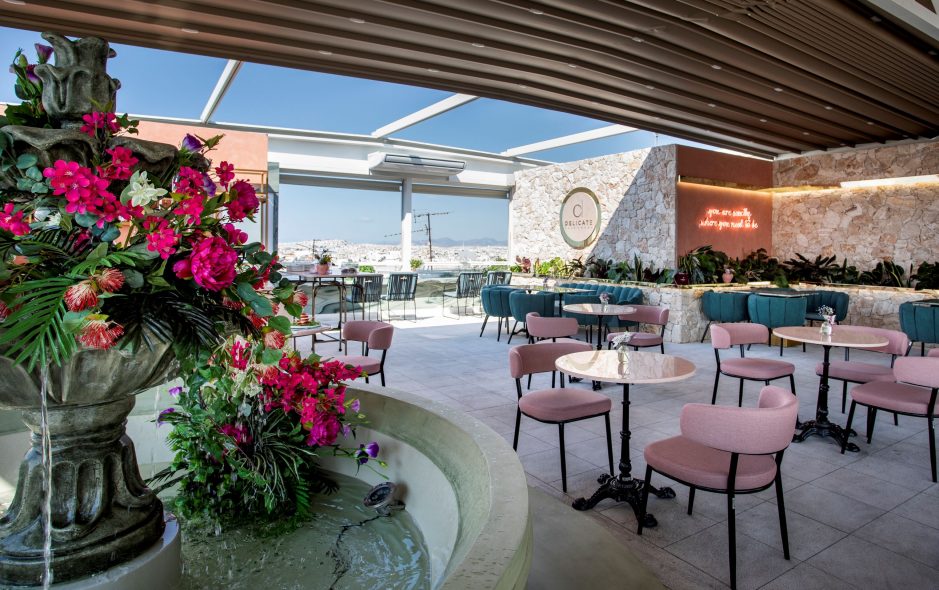 Πέρα από τις ιδιαίτερες γωνιές του, το Delicate μας εντυπωσίασε και με την απίστευτη θέα του, αφού περιμετρικά είναι ανοιχτό και όπου και αν καθίσεις μπορείς να δεις από τον λόφο της Ακρόπολης και του Λυκαβηττού μέχρι τα νότια προάστια. Σημείωσε δε, ότι αν πας αργότερα το απόγευμα ανοίγουν και την οροφή, οπότε μιλάμε για ένα ανοιχτό, δροσερό αλλά και ασφαλή -για τα δεδομένα της εποχής- all day προορισμό.
