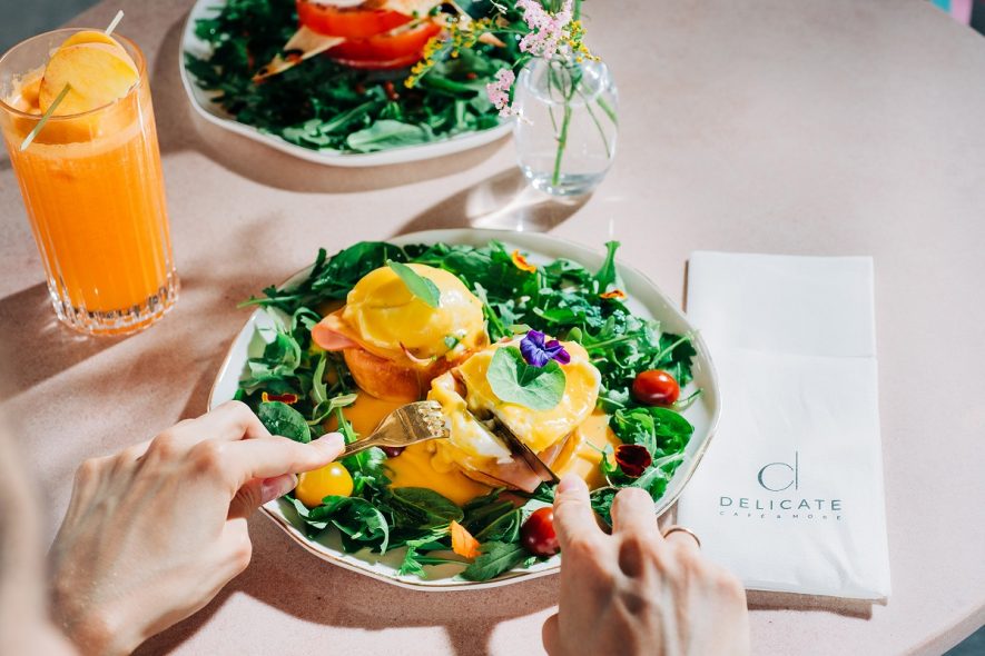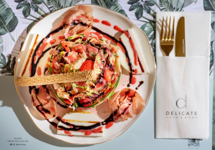Επιπλέον, στο Delicate βρίσκεις και δοκιμάζεις χορταστικά πιάτα για brunch ή ελαφρύ γεύμα, που έχει επιμεληθεί ο σεφ Άκης Τσίκος και εκτελεί καθημερινά στην κουζίνα η σεφ Μαρία Μαύρου. Επίλεξε ανάμεσα σε συνταγές με αυγά, όπως αυγά benedict, καγιανά ή πληθωρικό croque madame για brunch, αλλά και απολαυστικά pancakes με διάφορες γαρνιτούρες ή ένα χορταστικό σάντουιτς. Αν το επισκεφθείς ξεκάθαρα για φαγητό, σου προτείνουμε το ζουμερό burger με μπέικον, τσένταρ και σάλτσα ρεμουλάντ (το οποίο βγαίνει και σε μίνι εκδοχή, αν θέλεις να το μοιραστείς με την παρέα σου), αλλά και μία από τις δροσερές σαλάτες τους. Εμείς δοκιμάσαμε caprese με μοτσαρέλα, ντομάτα, πέστο βασιλικού και τραγανή τορτίγια, σερβιρισμένη σε στυλ ναπολεόν και πράσινη σαλάτα λαχανικών με προσούτο, ψητό μανούρι και βινεγκρέτ φράουλας. Σε αυτό το σημείο να αναφέρουμε ότι καθώς δίνουν ιδιαίτερη βάση στη φρεσκάδα των υλικών και στην εποχικότητα, μπορεί να βρεις αυτή τη σαλάτα σερβιρισμένη με βινεγκρέτ από άλλο φρούτο, ενώ το ίδιο ισχύει και για κάθε αλμυρό και γλυκό πιάτο ή χυμό που περιλαμβάνει φρέσκα υλικά εποχής.
