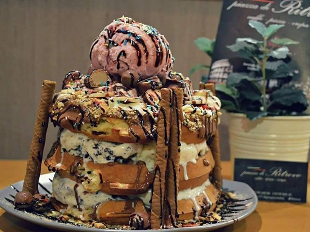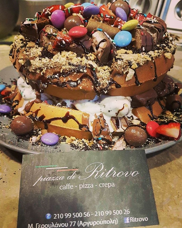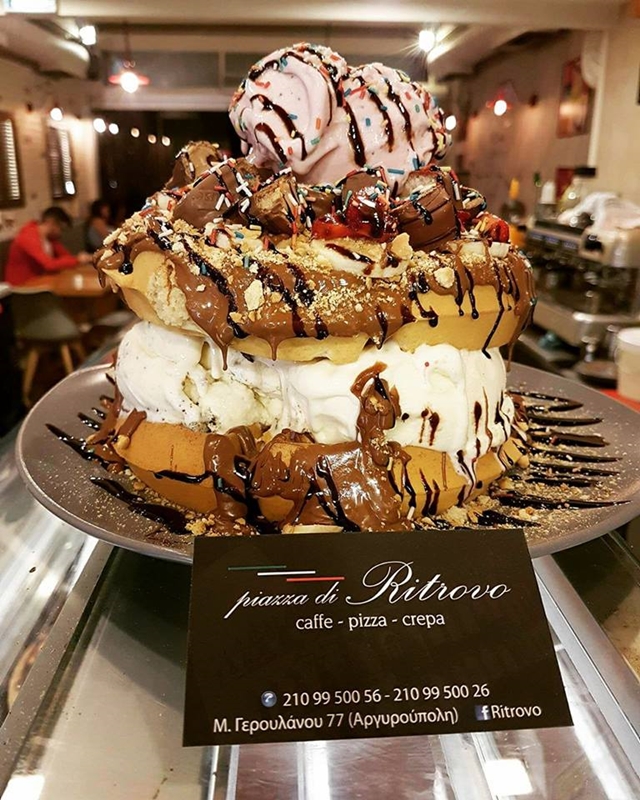 Εκτός όμως, από τη γλυκιά αυτή οπτασία που έχει γίνει πραγματικότητα, στο Piazza di Ritrovo θα βρεις νοστιμότατες πίτσες και κρέπες. Δοκίμασε οπωσδήποτε την κρέπα Ritrovo, ρολό κρέπας με δύο μπάλες παγωτό της επιλογής σου, επικάλυψη σοκολάτας και τριμμένο μπισκότο. Αυτά βέβαια, την επόμενη φορά που θα πας, γιατί είπαμε, παγκόσμια μέρα βάφλας, επιβάλλεται να το γιορτάσεις μεγαλειωδώς με waffle burger ή Castello. Και για ένα πράγμα να είσαι σίγουρος. Sweet dreams are made of this. Who has the mind to disagree?
