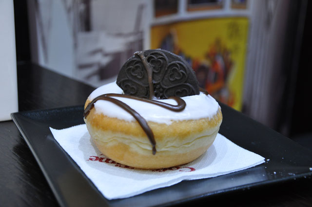 Σε κερδίζει: Από την εμφάνισή του, με αυτό το εμβληματικό σκούρο μπισκότο καρφωμένο στη μέση του donut με το λευκό γλάσο. Σαν πίνακας ζωγραφικής.