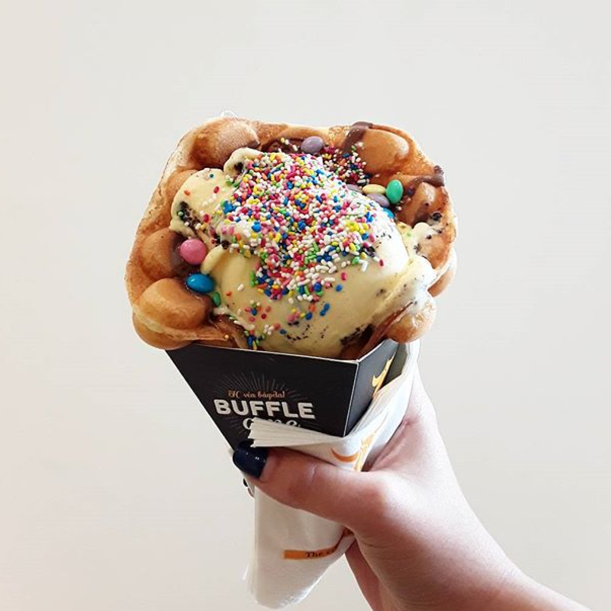Το “the talk of the town” Buffle Cone, που σίγουρα θα έχεις δει στα social media, στις εκατοντάδες αναρτήσεις των θαυμαστών του, είναι η μοναδικά φρεσκοψημένη βάφλα από αφράτη bubble ζύμη, που μετατρέπεται σε χωνάκι, γεμίζει με το αγαπημένο σου παγωτό και στολίζεται με τα πιο λαχταριστά toppings!