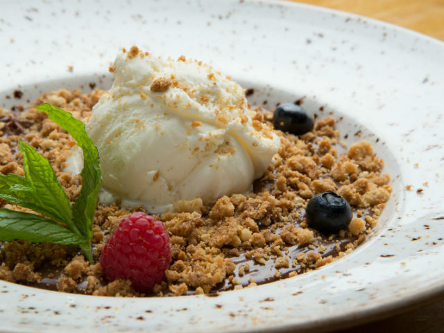 Το πρώτο που προσγειώθηκε μπροστά μου ήταν μια βελουτέ σοκολάτας με παγωτό βανίλιας Μαγαδασκάρης και crumble αμυγδάλου. Μόλις βούτηξα το κουτάλι μου, από την μία πόνεσε η ψυχή μου που χαλούσα την υπέροχη εμφάνιση του, αλλά, τη στιγμή που ακούμπησε τον ουρανίσκο μου, τα λησμόνησα όλα.