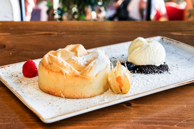 Αμέσως μετά ήρθε η Lemon pie με παγωτό. Αν το μπερδέψεις με τριαντάφυλλο κίτρινο που απλά βρέθηκε στο πιάτο δίπλα στο παγωτό, δεν θα σε αδικησω. Όση, όμως, ομορφιά ‘αναβλύζει’, άλλη τόση νοστιμιά κρύβει. Ίσως ανάμεσα στα μουγκρητά ευχαρίστησης να αρχίσεις τις συγκρίσεις με άλλες lemon pie που έχεις γευθεί. Σίγουρα θα καταλήξεις ότι είναι από τις καλύτερες.