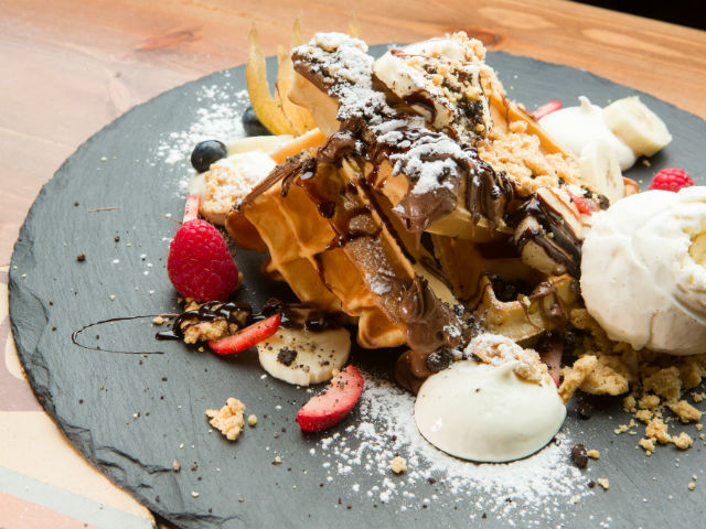 Τρίτο γλυκό που προστέθηκε στον κατάλογο είναι η βάφλα Living με κρέμα λευκής σοκολάτας, φρούτα και crumble αμυγδάλου. Αν θεωρείς ότι η βάφλα είναι ένα απλό σε εμφάνιση και γεύση γλυκό, τότε δες την φωτογραφία για να καταλάβεις. Είναι σαν ένας επαναπροσδιορισμός του όρου βάφλα αυτό το πιάτο μιας και δεν σε αφήνει -ούτε το στήσιμό του αλλά ούτε και η γεύση του- να σκεφτείς τίποτα άλλο.