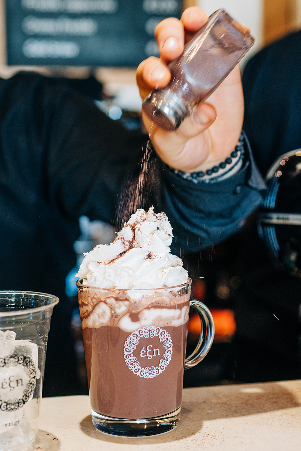 Δεν είναι λίγοι αυτοί που επιλέγουν το Έξη για τον πρωινό τους καφέ καθημερινά. Πρόκειται, μάλιστα, για μια αγαπημένη συνήθεια των νοτίων, είτε πρόκειται να πάρεις το ρόφημα για τη δουλειά, είτε πρόκειται να κάτσεις και να το απολαύσεις στον χώρο. Βέβαια, αυτήν την περίοδο, στο αγαπημένο μας ζαχαροπλαστείο θα βρεις την christmas edition του ζεστού καπουτσίνο, με σιρόπι μελομακάρονο και τριμμένο καρύδι από πάνω, φτιαγμένο με όλη την τέχνη και την αγάπη των baristas. Παράλληλα, ένα από τα πιο χειμερινά και χριστουγεννιάτικα ροφήματα είναι φυσικά η ζεστή σοκολάτα. Στο Έξη θα βρεις την κλασική της εκδοχή, αλλά και δύο γευστικές παραλλαγές του κλασικού ροφήματος, με βάση τη λευκή σοκολάτα. Μιλάμε για πραγματική μαγεία στο ποτήρι σου!