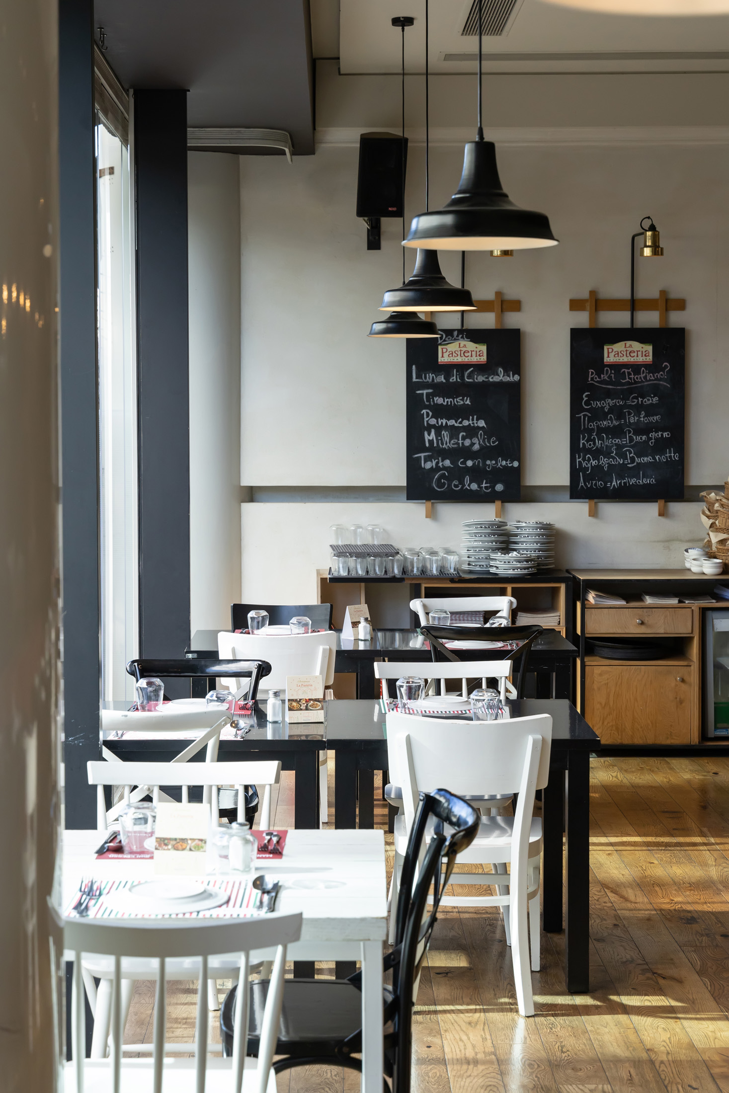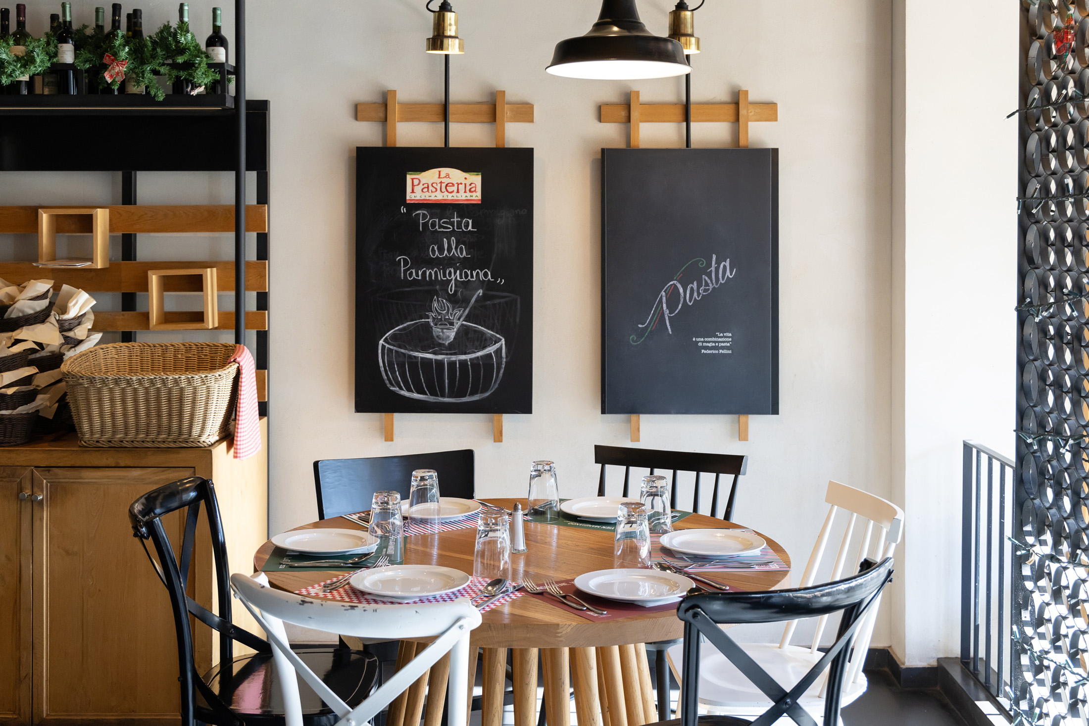 Όμως είναι οι μικρές λεπτομέρειες της διακόσμησης που δίνουν στη La Pasteria τον ιδιαίτερο χαρακτήρα της και αναδεικνύουν την προσοχή και την αγάπη με την οποία οι άνθρωποί της προσπαθούν να μας μεταφέρουν σε μια παραδοσιακή trattoria. Στους τοίχους μαυροπίνακες όπου με κιμωλία είναι γραμμένα διάφορα πιάτα και fun facts για την ιταλική κουζίνα ή αστείες ζωγραφιές, πάνω στα τραπέζια σουπλά με τα χρώματα της ιταλικής σημαίας σε ευφάνταστους συνδυασμούς και μοτίβα και ιταλικά quotes σε διάφορα σημεία του μαγαζιού, που σε καλούν να απολαύσεις το φαγητό σου.